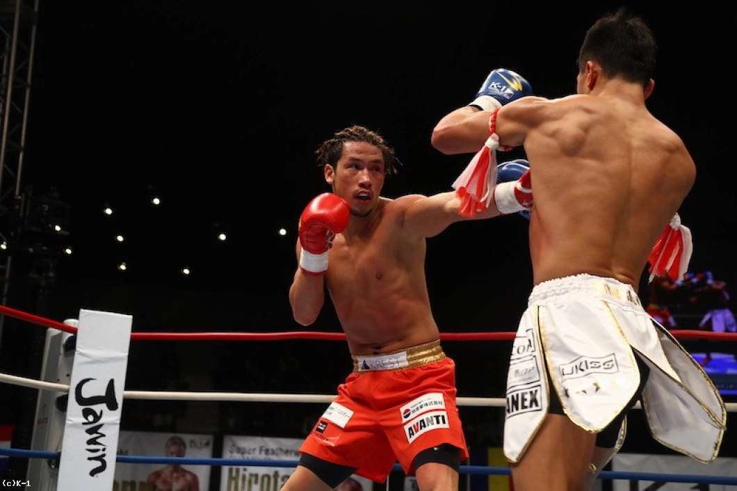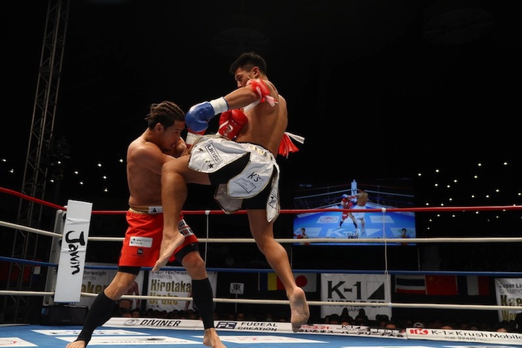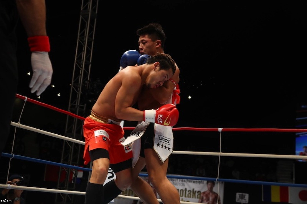 2R、右ストレートを強振して出る弘嵩に、大雅は跳びヒザを返し、距離ができると左のミドルを飛ばす。重心を低くして向かう弘嵩は左手を前に伸ばし、そこから右ストレートを繰り出す。大雅はこれに左ストレートを放って対抗。ラウンド後半、大雅は右フック、左ストレートとラッシュし、さらに跳びヒザを放つ。防戦に回る弘嵩。さらにロープへ詰めると左ハイ、右フック、左前蹴りと大雅は攻める。だが、弘嵩も右ストレート、跳びヒザと返す。最後は大雅が再びロープに詰めて攻め終了。