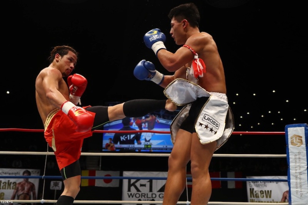 3R、両者打ち合いもここは均衡が崩れない。だが、徐々に大雅が前に出るのが目立ってくる。弘嵩はこれをボディへの前蹴りを放って押さえる。だが大雅は横へ回り、そこから右フック、左ストレートと攻勢に入る。弘嵩の前蹴りを左右のステップでかわし、軽やかな動きが戻ってくる大雅。弘嵩のジャブに左ストレート、右フックと大雅はカウンターを合わせる。右ミドルを放つ弘嵩だが、大雅は左ストレート、右フック、左ハイと加え、遂に弘嵩が体勢を崩したところでレフェリーがダウンを宣告。