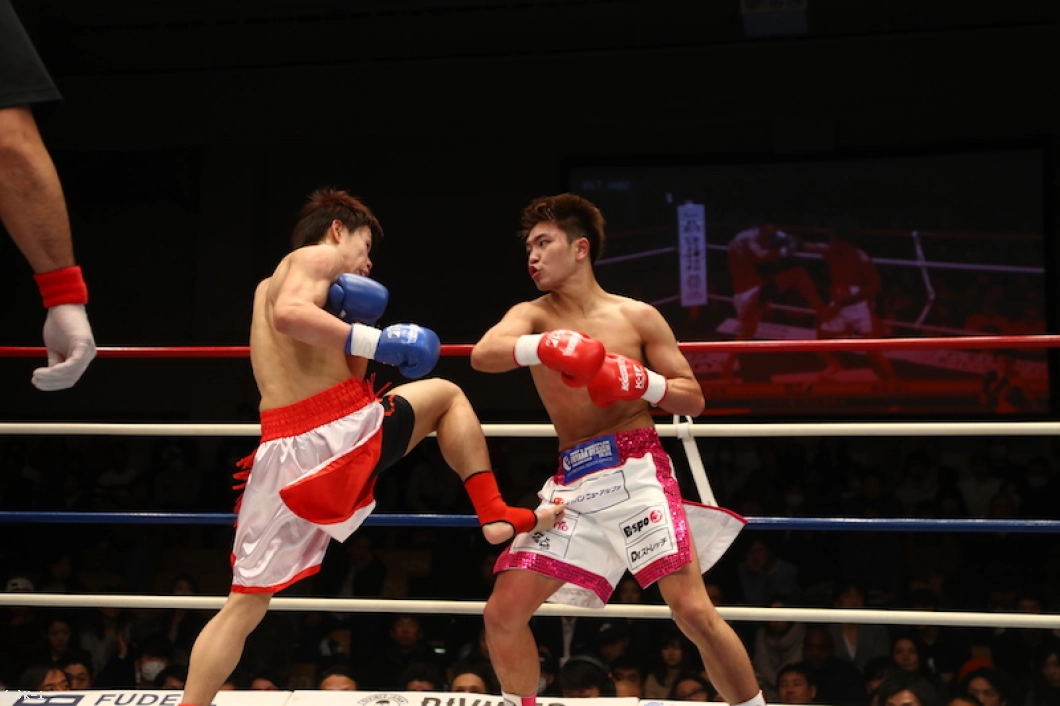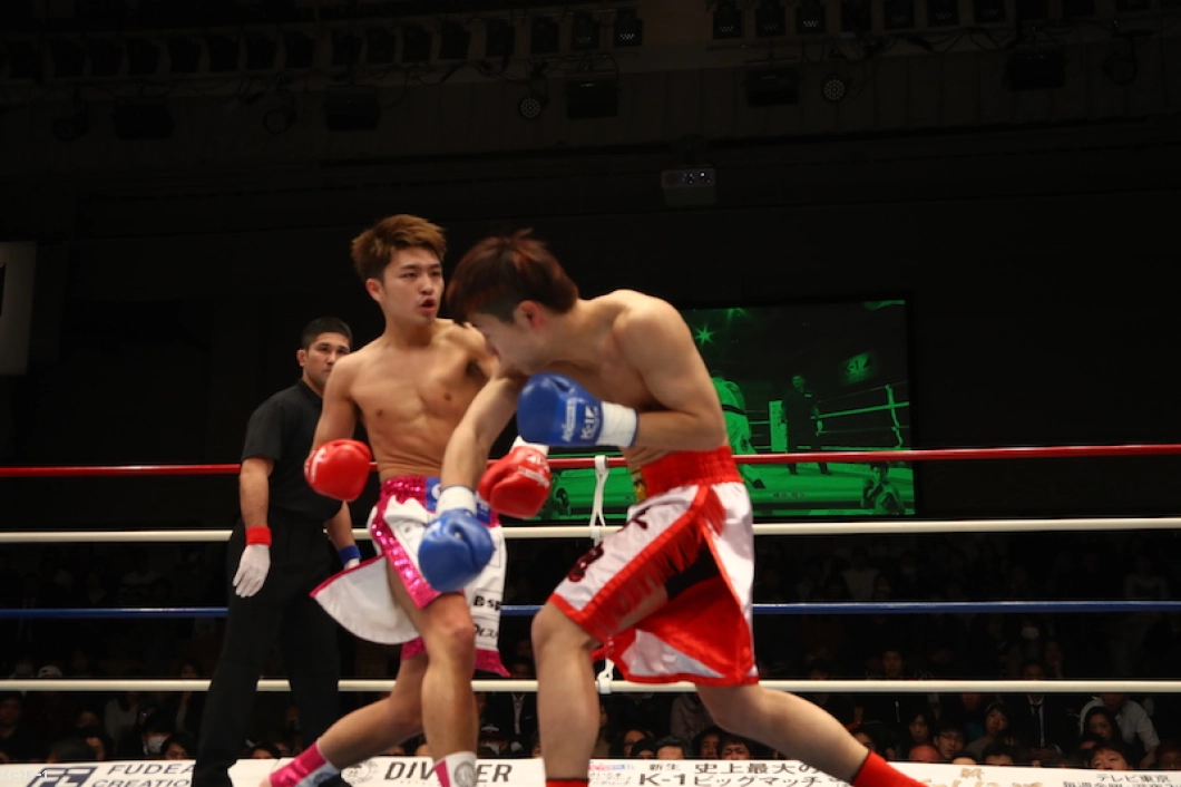 2R、西京はボディストレートから顔への左ストレートを振るうが、椿原は勘のよさを見せ頭を振って当てさせない。西京の左ストレートをかわし、逆に左フックのカウンターでとらえる場面も見せる。右前蹴りからアッパー、フックと西京にパンチをまとめて。待ちの態勢の椿原だが、西京も警戒して攻め入ることができない。