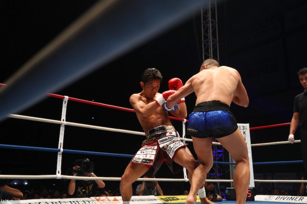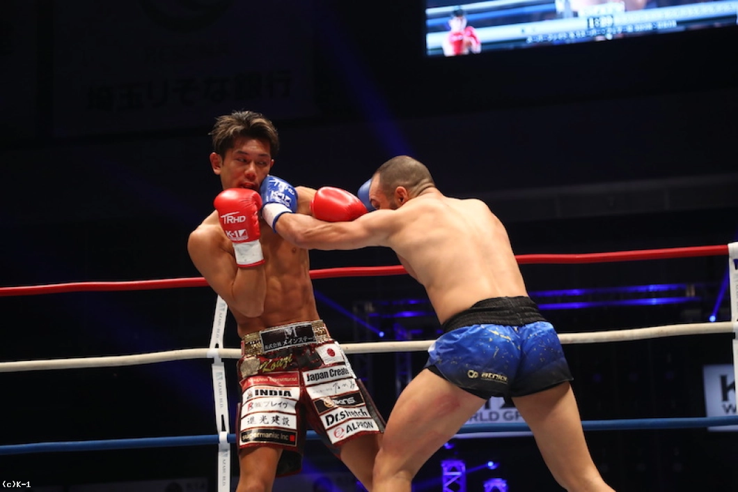 1R、ガードを固め前に出るスタウロスに対し、皇治は右ローを当てていく。しかしスタウロスも右ローを返し、アッパーを交えて自慢の強打を振るう。ローからパンチで皇治をロープ際に詰めるスタウロスだが、皇治もカウンターの右ストレート。皇治はブロックを固め、ローを蹴りながら打ち合いに応じる。