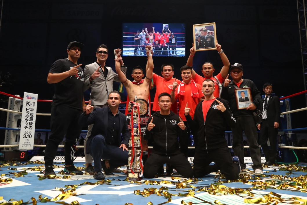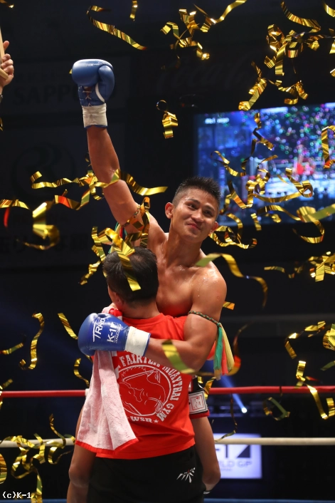 「ミナサン、コンバンハ。今日は勝てて嬉しかったです。応援ありがとうございました。これからも応援よろしくお願いします。アリガトウゴザイマス。もうすぐ35歳になりますが、全力で戦っていきます。よろしくお願い致します。左右田選手、これからどうなるか分かりませんがリベンジしたかったらお願いします。ムエタイボクシング、ナンバー1!」