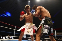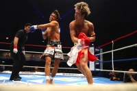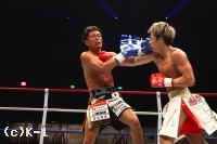 2R、武尊のジャブ、ローに対し、皇治は左右フックを振るって前に出る。しかし武尊はすぐにヒザから左右のフックと反撃に転じる。武尊はパンチ一辺倒にならずヒザを使い、そこからフックを振るう。両者左右フックをブンブンと振るうも見切って当てさせない。