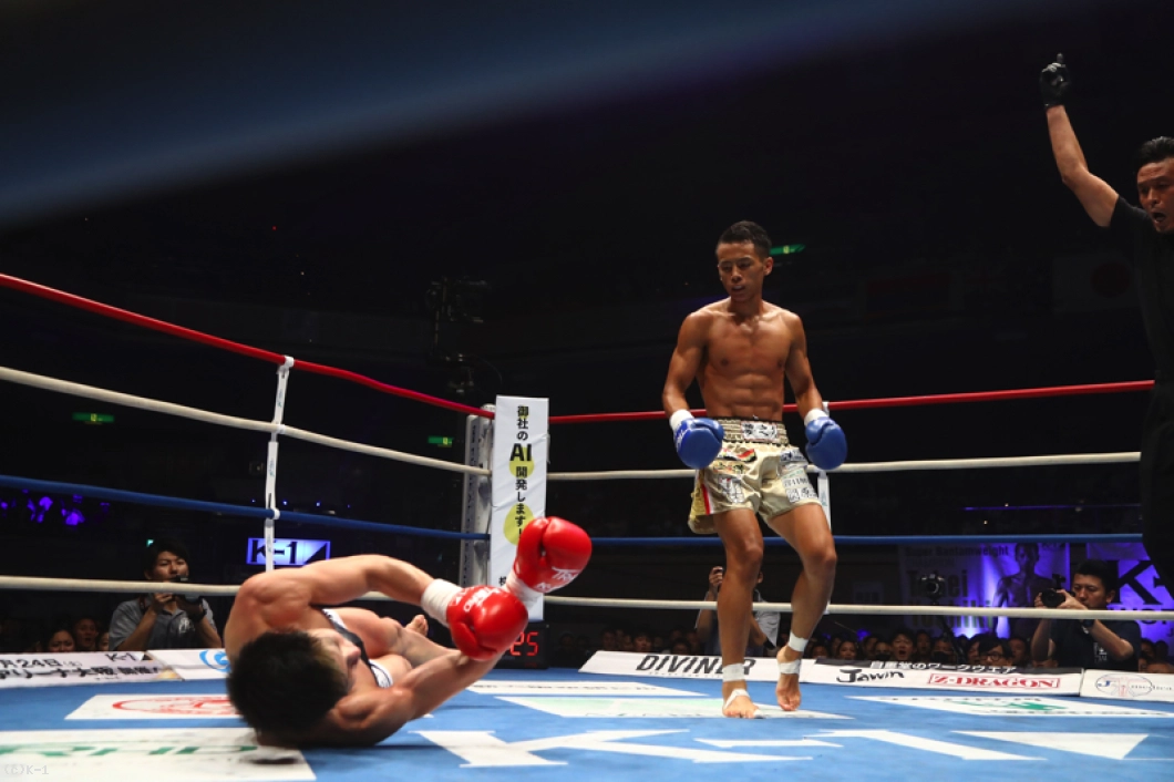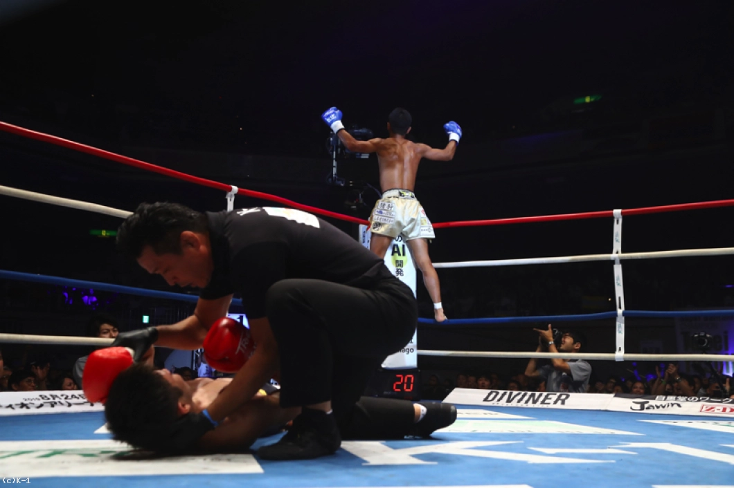 2R、今度は武居の蹴りがローブローとなってしまうが、玖村はすぐに試合再開に応じる。再開後、一瞬の組んだ状態からすぐに手を放し攻撃した玖村だが、武居は逆にそこへ右フックを見舞い、玖村が倒れていくところへ顔面に左の蹴りを一閃。レフェリーは倒れ方を見てすぐに試合を止め、武居が武尊でも成し遂げることができなかった全試合KOでのトーナメントで優勝を決めた。