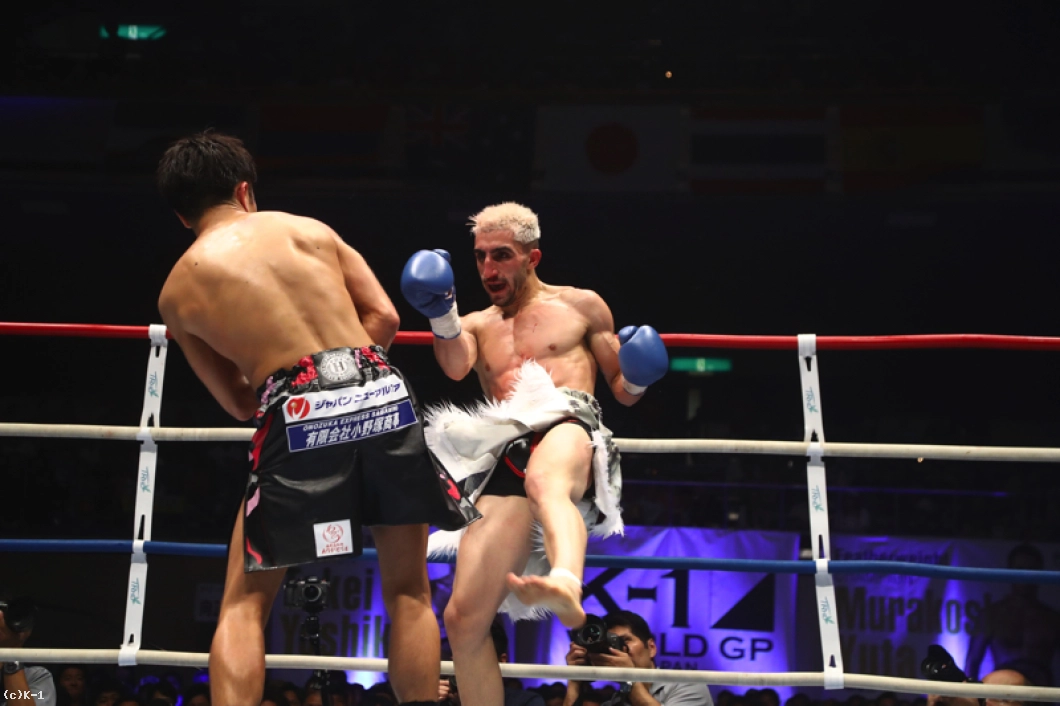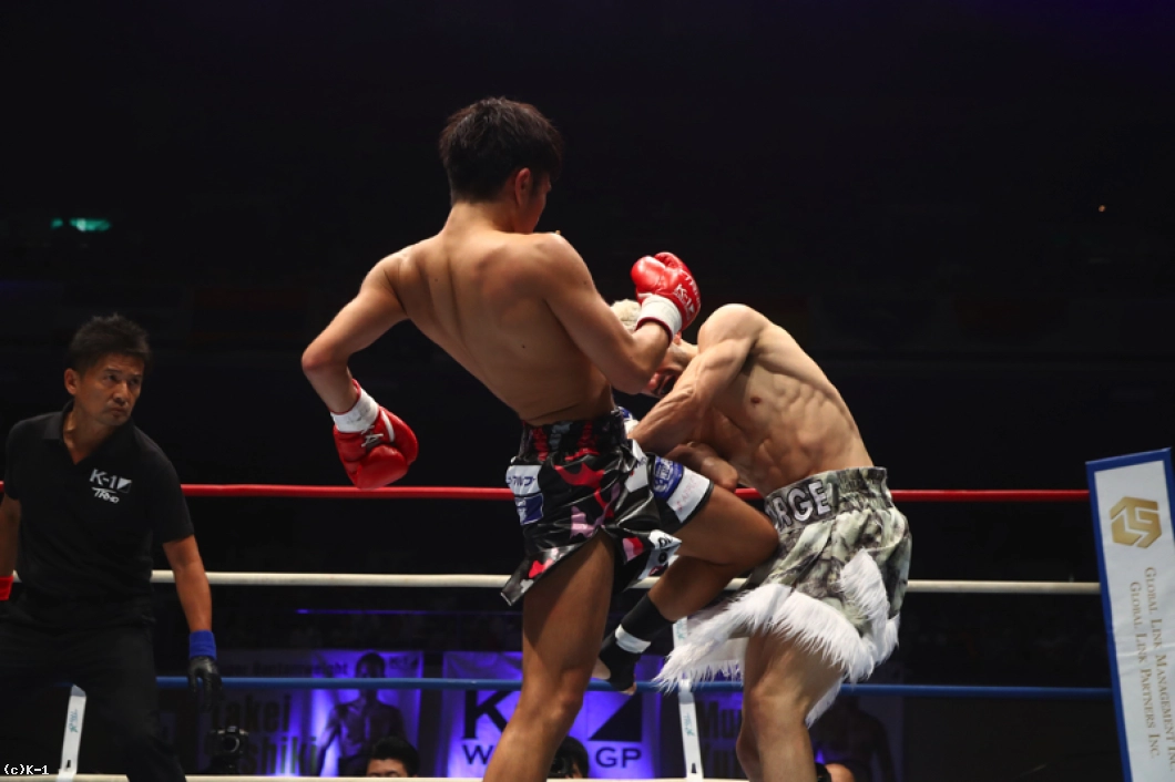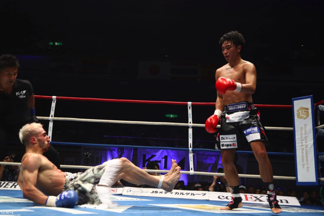 それもあって2Rの中盤から若干気持ちが折れてるなっていうのを顔見て思ったんで、削って削って。で、3R腹が効いて、うまく顔に入りましたっていう感じですね。(KOは)いや、狙ってないです。うまく倒れればいいなっていうぐらいで。(今後の目標は?)狙ってるところは村越選手のK-1のベルトなんで、近いうちにでも挑戦させてくれれば僕が獲って、もっといいチャンピオンになる自信があるんで、これからの試合も期待していてください」