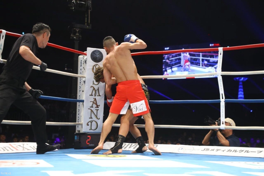 右ストレート、左フックと打ち返す皇治だが、川原は右フック、右アッパーと皇治をコーナーから逃がさない。皇治はヒザを返すが、川原もボディへのヒザ。皇治はジャブ・ワンツーから左インロー。川原はプレッシャーを落とさず、ボディへのフックから顔へのフックを走らせる。川原は首相撲で注意を受けるも、サウスポーからの左ストレート、右フックとさらに襲う。しかしここで皇治が右ハイから右ストレートでダウンを奪い返す。ここで終了のゴングとなる。