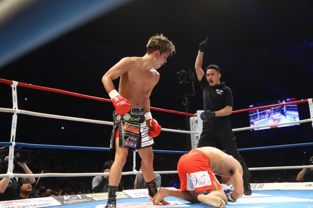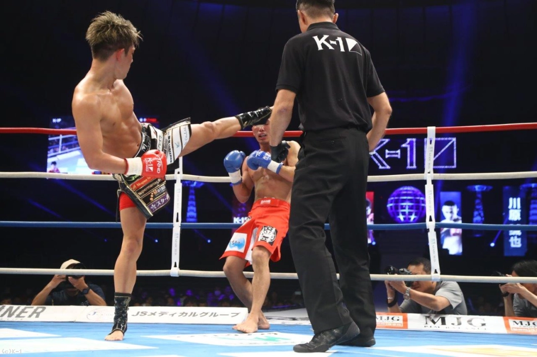 1R、川原が左インローからジリジリと間合いを詰める。そして左フック、右ストレートと放ち、左フックで皇治をヨロめかせる。そこから川原は右・左とフックを猛連打し、皇治をスタンディングダウンに追い込む。再開すると皇治は右ローからボディへのヒザ。川原は止まらず、右ストレート、左フックと皇治に連打。左フックを受け皇治は腰が落ちそうになる。