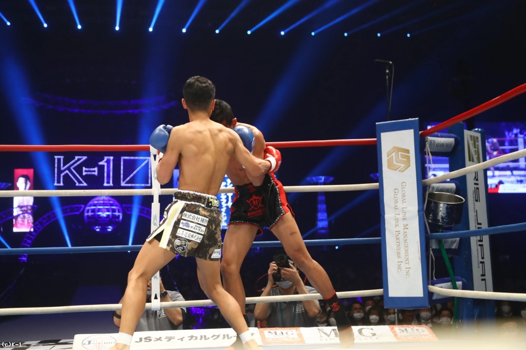 武居はデンサヤームの左ミドルの直後にフックを返し、ボディフックでも襲っていく。武居はステップインしながらボディフックで迫るが、やはりクリンチで抱え込まれる。攻め込む武居だが、長いリーチを持つデンサヤームのクリンチに捕まってしまう。