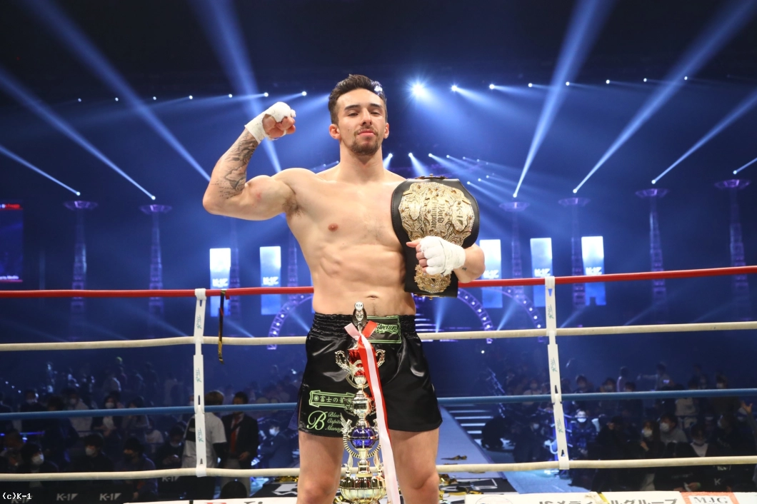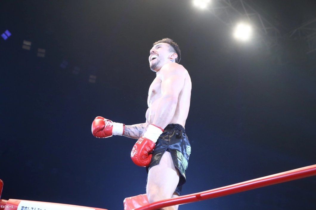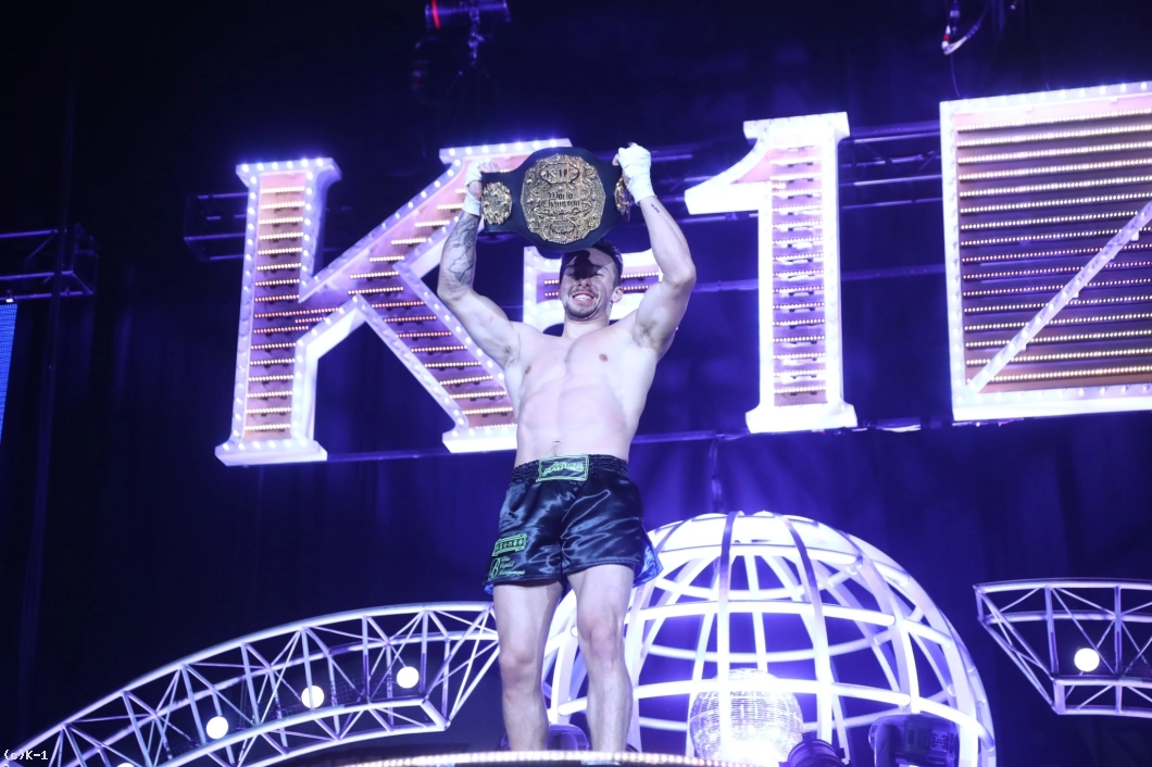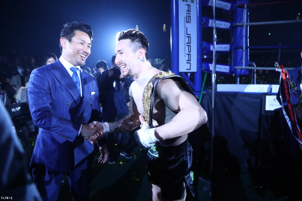 「みなさん、お疲れ様でした。応援ありがとうございました。まだこのベルトを巻いているのが信じられないぐらい、子どもの頃から夢でした。この階級で獲れたのが意味があって、誇り高い気持ちでいっぱいです。僕は解説席のレジェンドに比べればまだまだですけど、魔裟斗選手を超えれるようなスーパースターになるので応援してください。今日は最高でした。ありがとうございました」