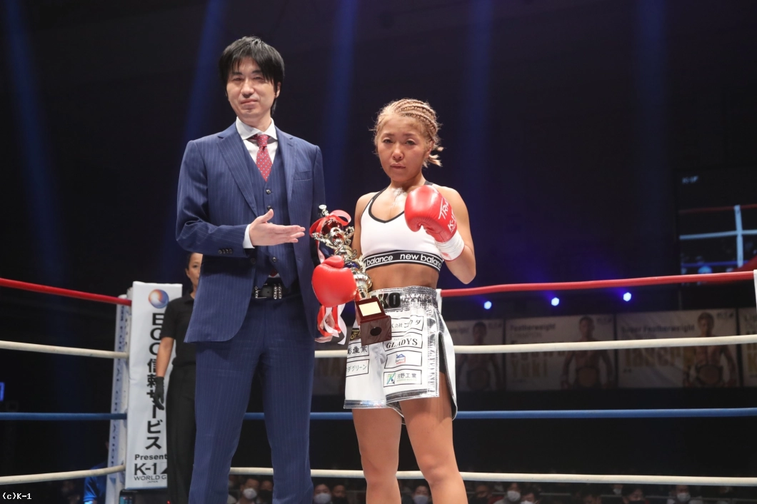 (相手のトリッキーな技は)あんまり気にはならなかったですね。自分もけっこう蹴りとか蹴り込んで練習してたんで、試合では蹴りも出せてたかなと思うし、そこは別に気にならなかったです。(2Rのラッシュが3R続かなかった?)そうですね。課題ですね、頑張ります。(ファンにメッセージを)今回、会場に足を運んでくださった方、あとABEMAで見てくれてる方、応援本当にありがとうございました。今日の試合で、いろいろ自分の課題がまた見つかったんで、そこを直しつつ、自分の階級で一番が取れるように、しっかりまだまだ向上していくんで、頑張るんで、応援よろしくお願いします」