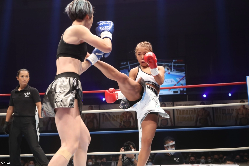 2R、距離を取っていた山田だが、右ミドルから右フックを強打。これに優がガードを固めると山田は左右連打をまとめ打ちし攻め立てる。山田はパンチの回転が速く、一旦攻撃に入ると、頭を振りながら上下にフックを打ち分ける。優は被弾で鼻血が見られる。