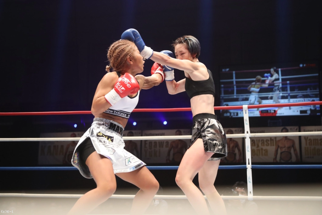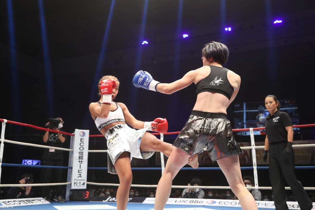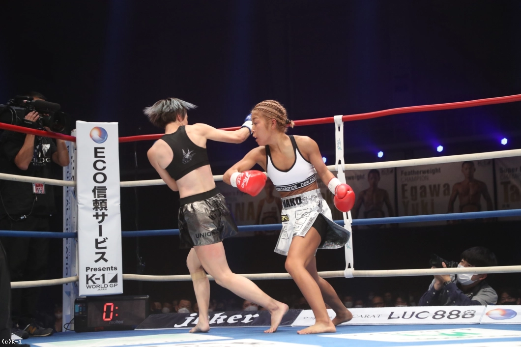 「(試合の感想は)ホント悔しいですね。自分的に手応えがあったけん、倒せた試合だったんですけど、詰めが甘かったっていうか。そこが次の課題かなと思います。(試合後も悔しそうでしたが)そうですね、やっぱ今回の大会にかける思いが強かった分、ホント悔しかったですね。(相手の印象は)去年のKrushに出させてもらった時に一緒に練習したことがあって、会場でも、『真子ちゃん頑張れ』って言ってもらったりしてて、それ以来やったんですよね。やけん、計量の時もお互い笑みが出ちゃったり、試合前とかもお互い笑って。そういうところでは緊張感がほぐれたというか。外からのパンチ、1発2発はもらったと思うんですけど、重かったなっていう印象があります。