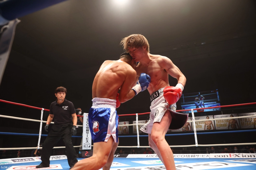 2Rも大石がジャブ、ストレートから左ボディを繋げる。パンチを返しローを入れて押し返さんとする西林だが、大石は圧力を弱めない。ロープを背負わせ、左ボディフック、右フックと西林を襲う大石。タイミングよくハイキックを決める西林だが、大石の勢いを落とすには至らない。