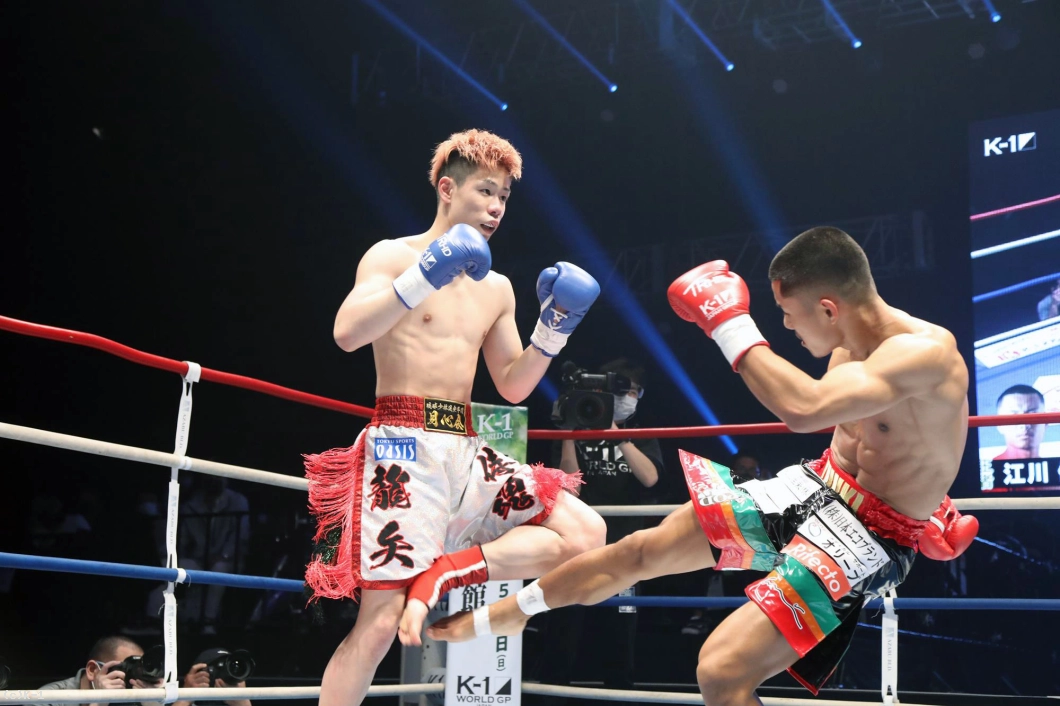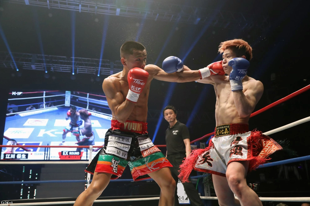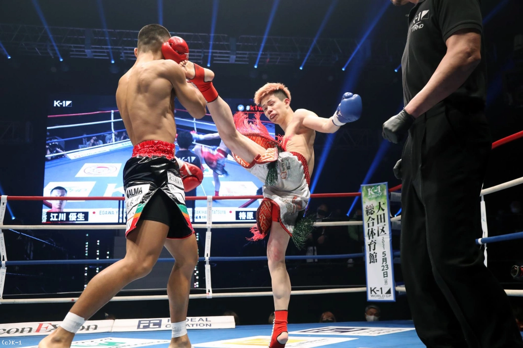 3R、江川はミドル、椿原は前蹴り。江川はミドルを出しながら前に出ようとするが、椿原はステップワークでかわし、ハイキックも繰り出す。中盤以降、江川はパンチの手数を増やし、前進して連打に行こうとするが、椿原は距離を保ちつつ左右のパンチを突き出し、ハイも交えて応戦。判定は椿原に1票入ってのドロー。決着は延長Rに持ち越された。