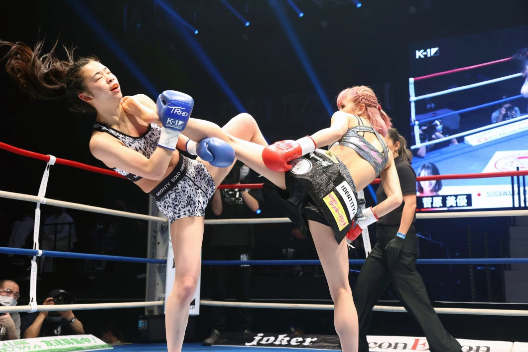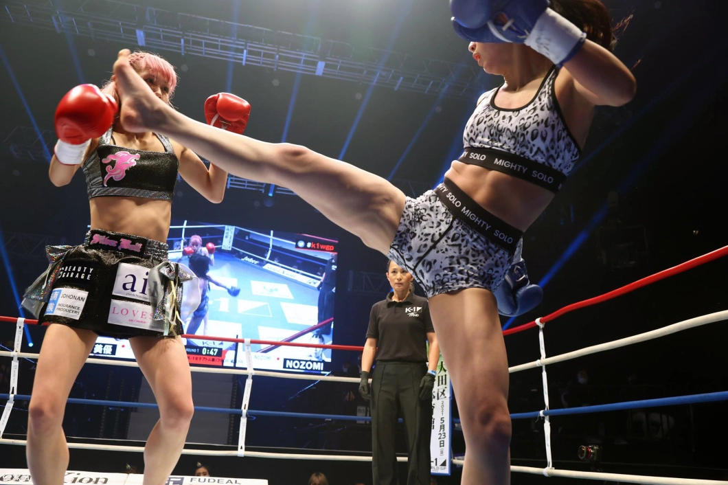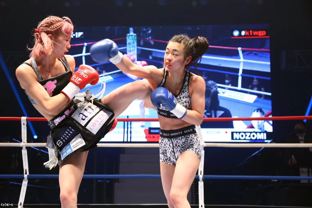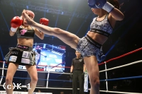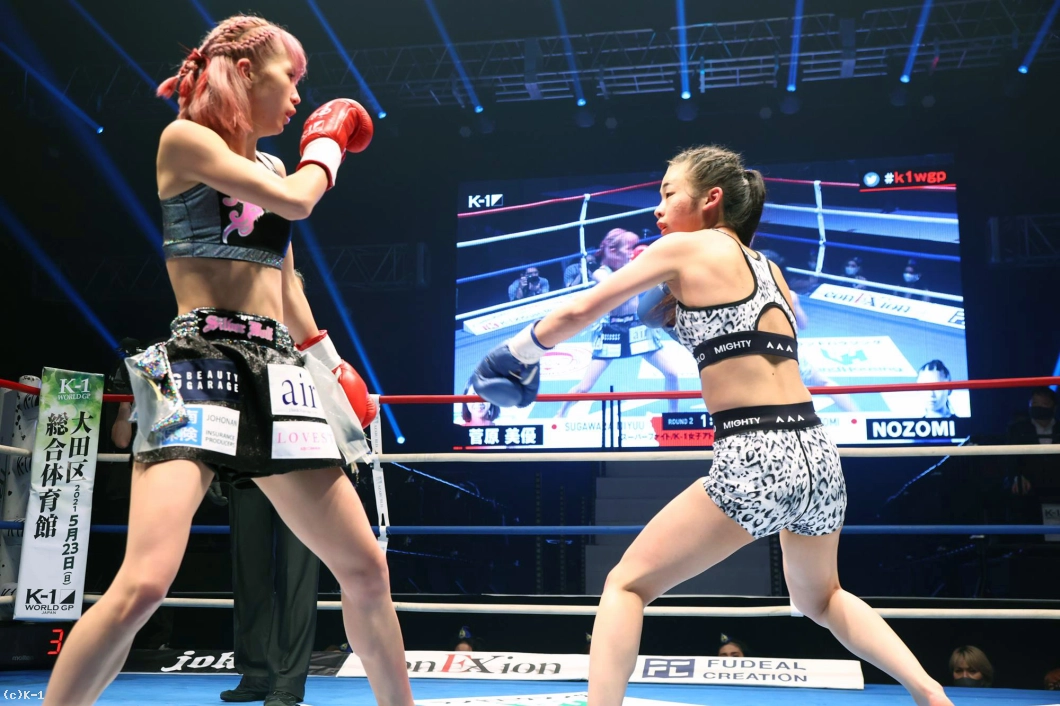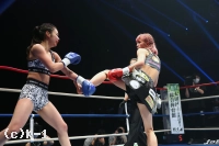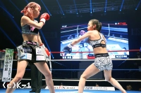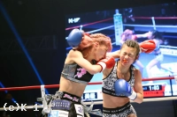 2R、ステップを使って突破口を探すNOZOMIに対し、菅原はリング中央に構えて前蹴りでけん制。ロープ際、蹴りで距離を作っての右ストレートでNOZOMIがダウン。NOZOMIはパンチを振るって出るが、やはり入ることができない。