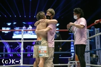 3R、江川も大岩の圧力に対抗するように前に出る。右ローを効かせる江川。だが大岩もボディへのヒザを返す。大岩は圧力でまさるか江川をロープ際に追い詰める。大岩が押し勝つ形で終了のゴングを聞く。判定は30-29、30-29、30-28の3-0で大岩の勝利。大岩が江川から勝利をもぎとった。