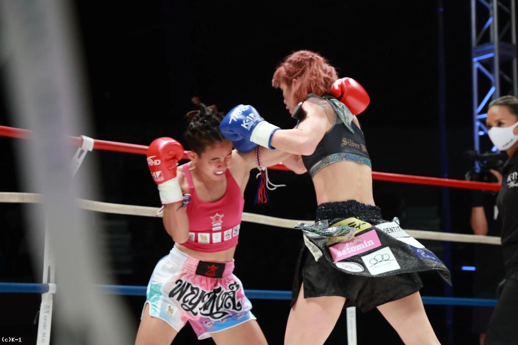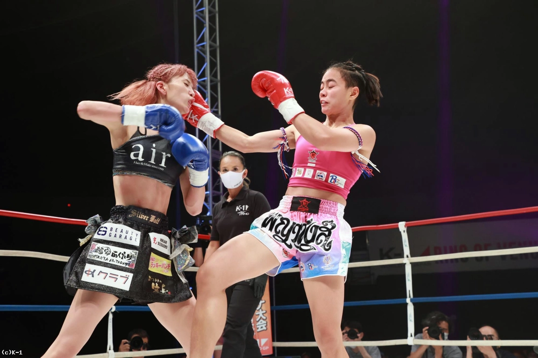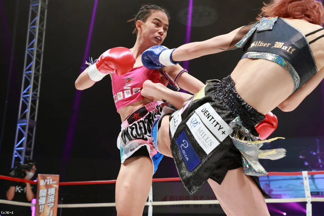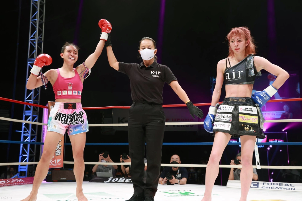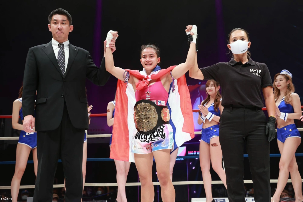「(試合の感想は?)タイ人として初のK-1女子王者になれて、本当にうれしく思ってるし、光栄なことだと思ってます。(対戦相手の印象は?)1回戦目に関しては体格も同じくらいでしたし、自分が思うように技を出すことができたんですけど、決勝は菅原選手は背も高くて、思ったような試合運びができない部分はありました。(今日の自分の動きでよかったところは?)1回戦目は蹴りの部分で対戦相手を上回ったと思います。決勝は自分が思ってるような試合ではなく、全力が出せなかったです。