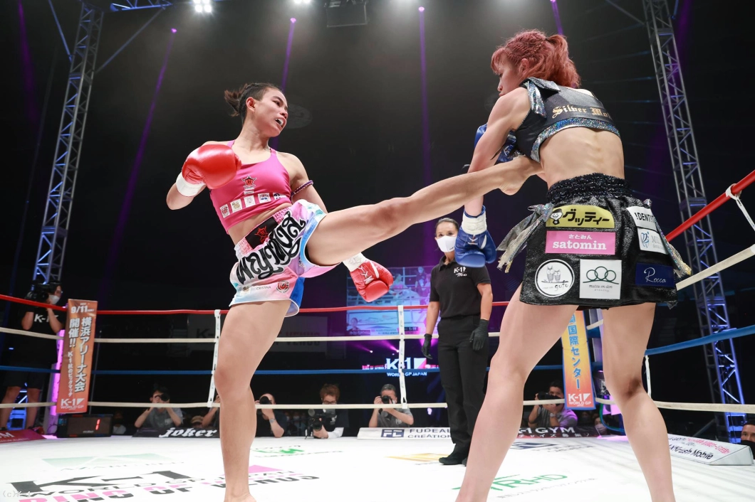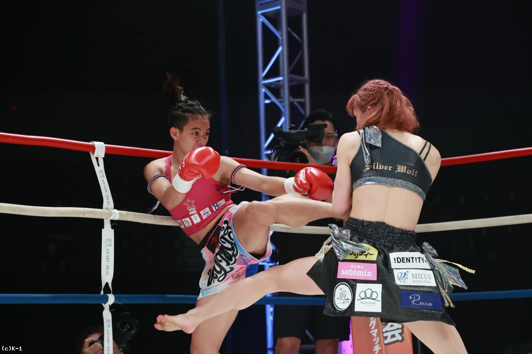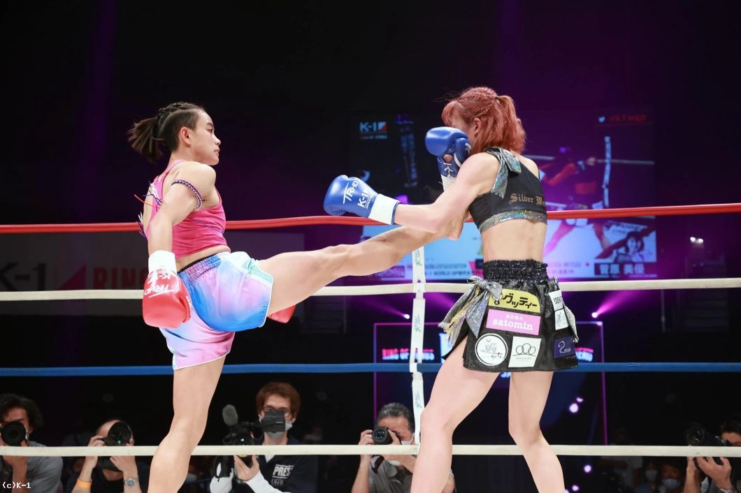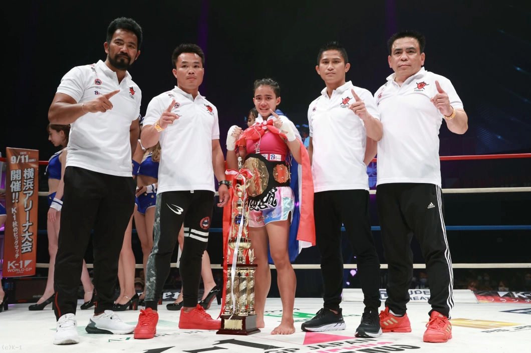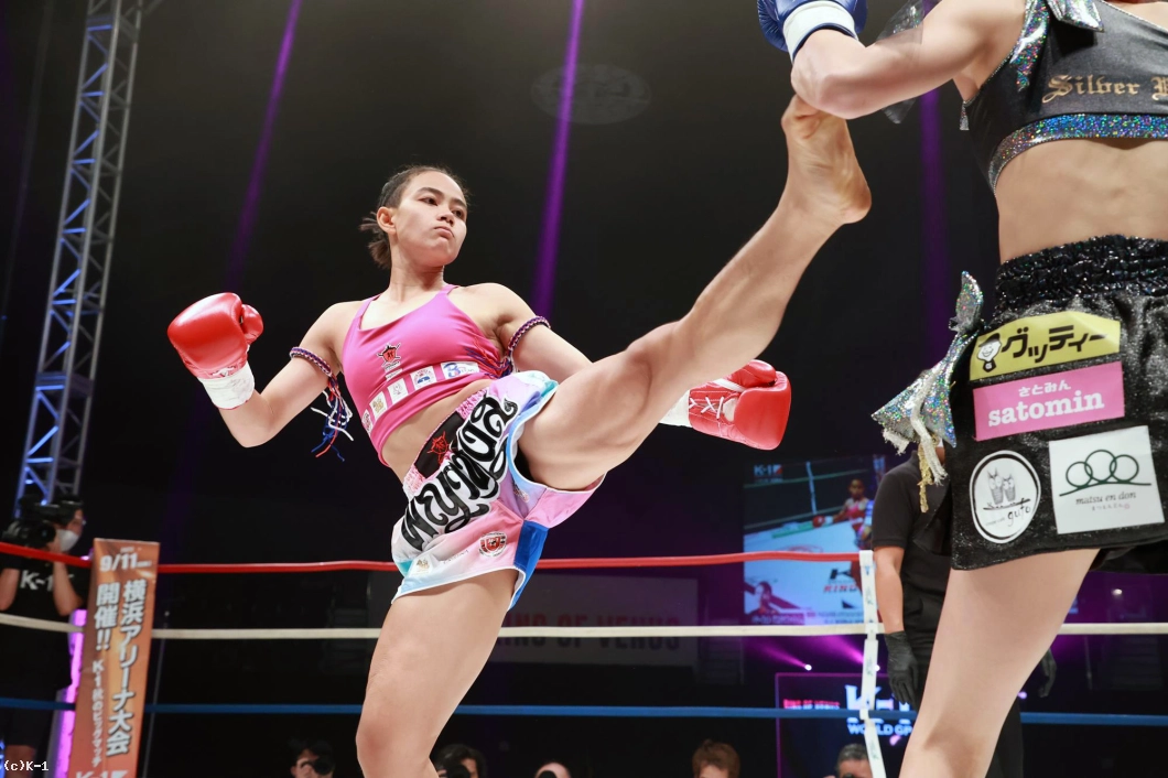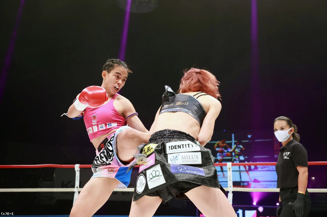 「(試合の感想は?)タイ人として初のK-1女子王者になれて、本当にうれしく思ってるし、光栄なことだと思ってます。(対戦相手の印象は?)1回戦目に関しては体格も同じくらいでしたし、自分が思うように技を出すことができたんですけど、決勝は菅原選手は背も高くて、思ったような試合運びができない部分はありました。(今日の自分の動きでよかったところは?)1回戦目は蹴りの部分で対戦相手を上回ったと思います。決勝は自分が思ってるような試合ではなく、全力が出せなかったです。