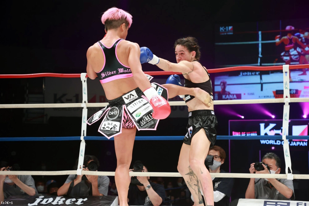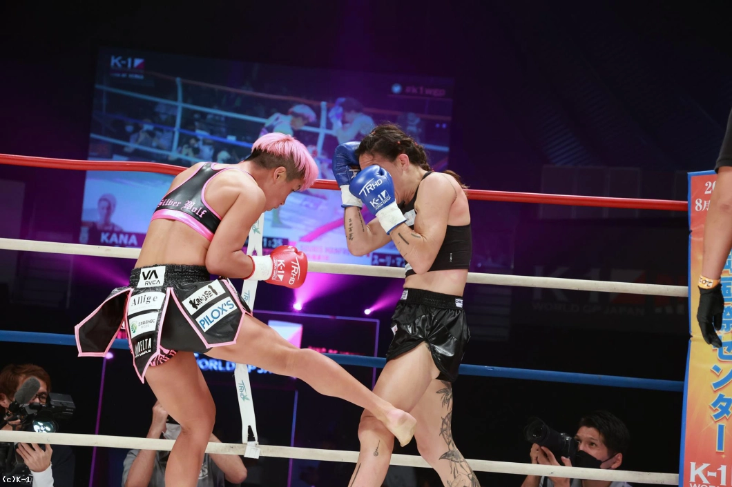 1R、KANAは速いステップで前後左右に動いてローキック。マンフレディもローを返す。インローも入れ、頭を振って前に出るKANA。マンフレディがミドルを入れてもローを返し、ロープを背にしたところで右オーバーフックでダウンを奪う。立ち上がったマンフレディにKANAはローからパンチを散らし、右ストレートでヨロめかせてスタンディングダウンを追加する。連打でフィニッシュに向かったKANAだが、マンフレディが右フックをカウンターで打ち込む。両者もつれたところをレフェリーに分けられると、KANAはダメージがあったか思わずバランスを崩してしまう。