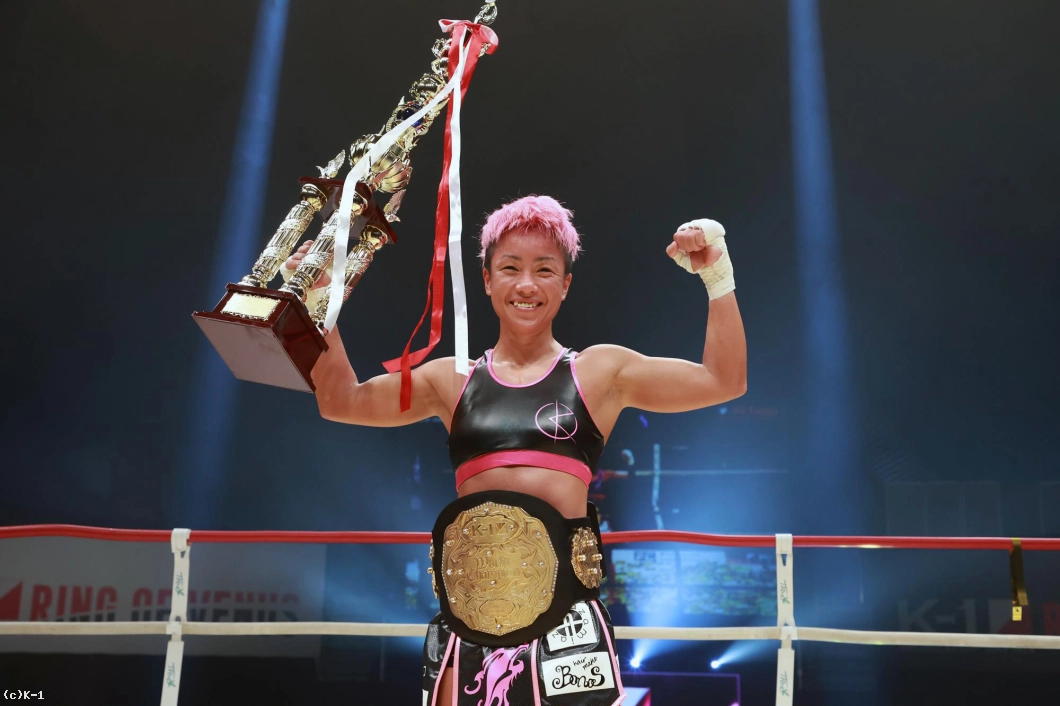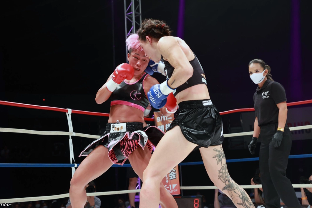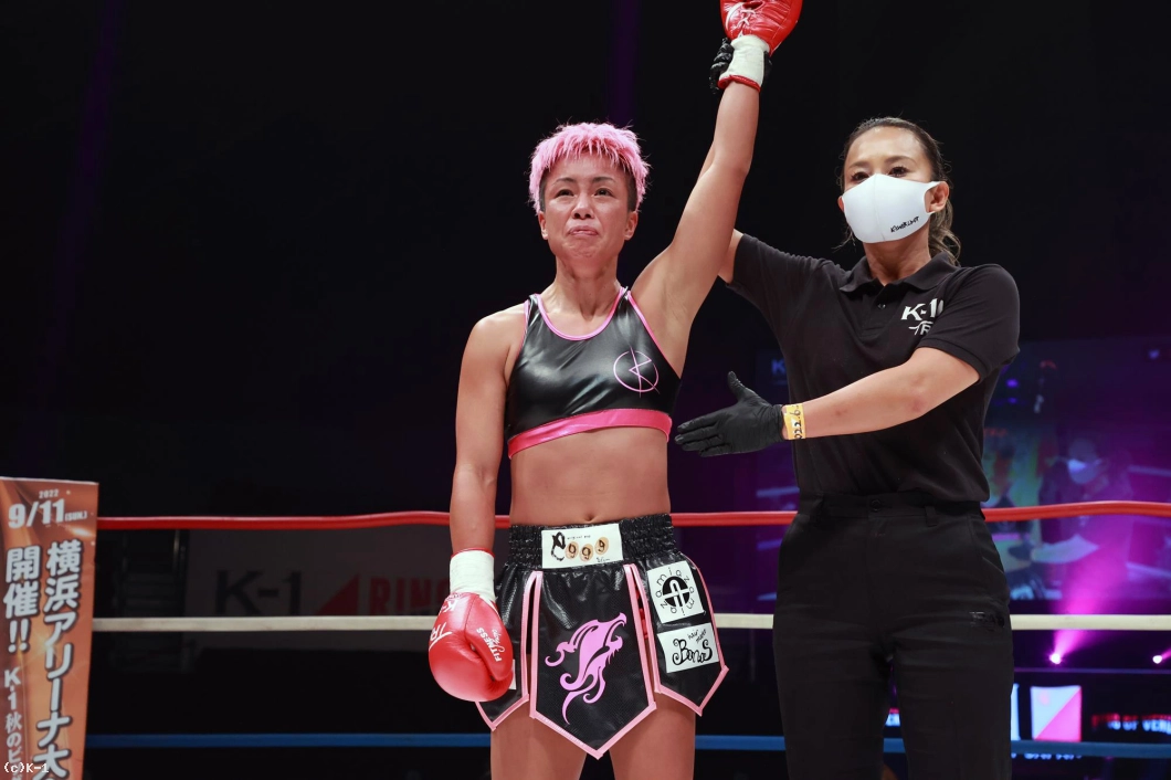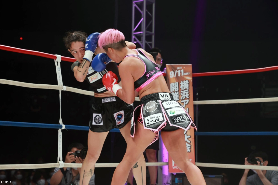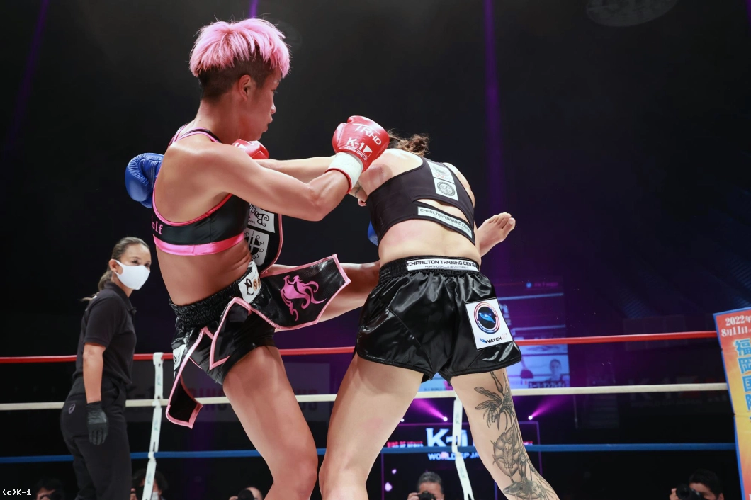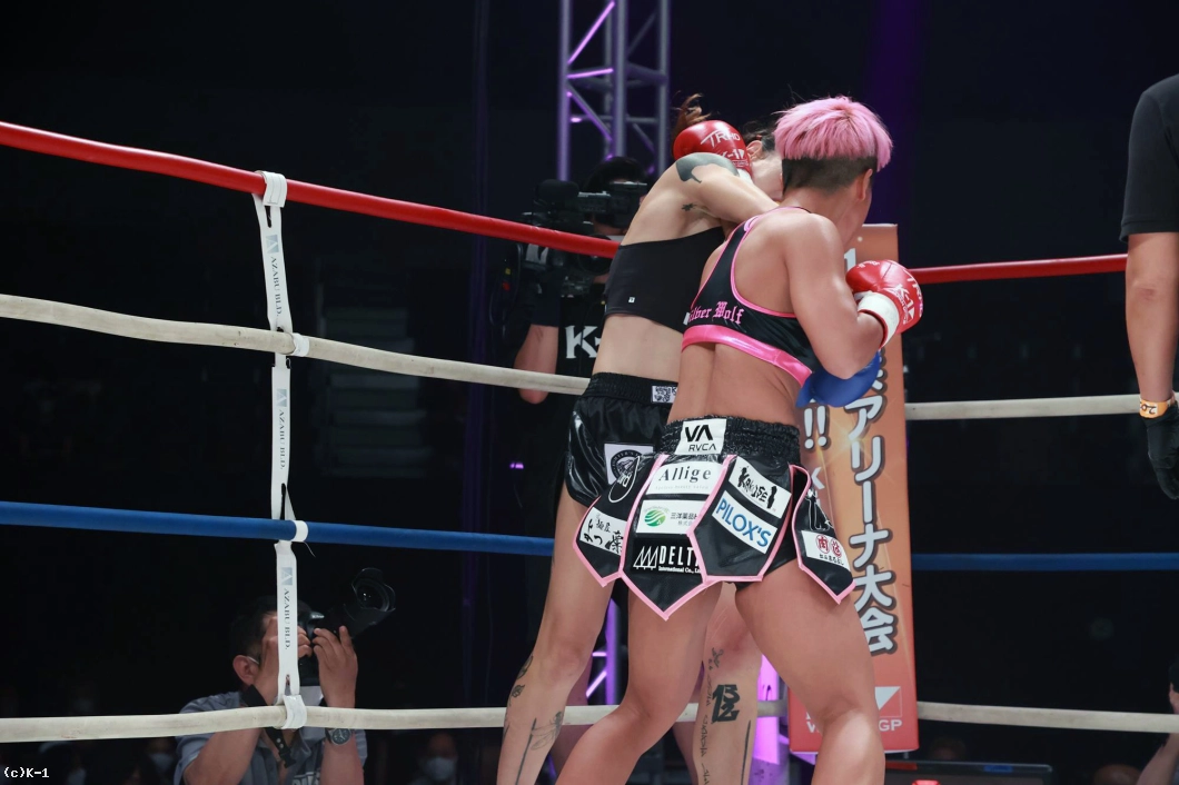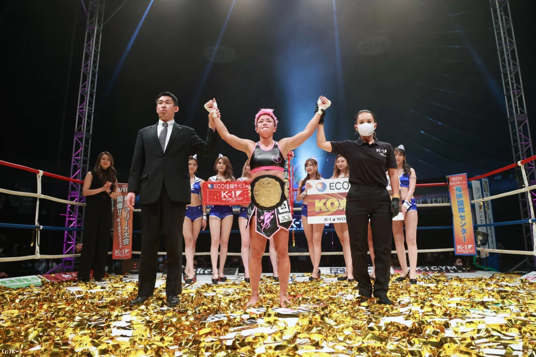 (K-1最強っていうのも絶対に言いたかった?)KOで勝って、絶対に言おうと思ってました。(ファンの方にメッセージを)今日は応援ありがとうございました。そして、K-1の女子の選手もみんな、ありがとうございました。これからも自分が女子の先頭を走って、K-1をもっともっと大きくしていくんで。このK-1の女子の舞台をみんなに目指してほしいと思います。これがK-1の女子のスタートだと思ってるんで、これからも応援よろしくお願いします。ありがとうございました」