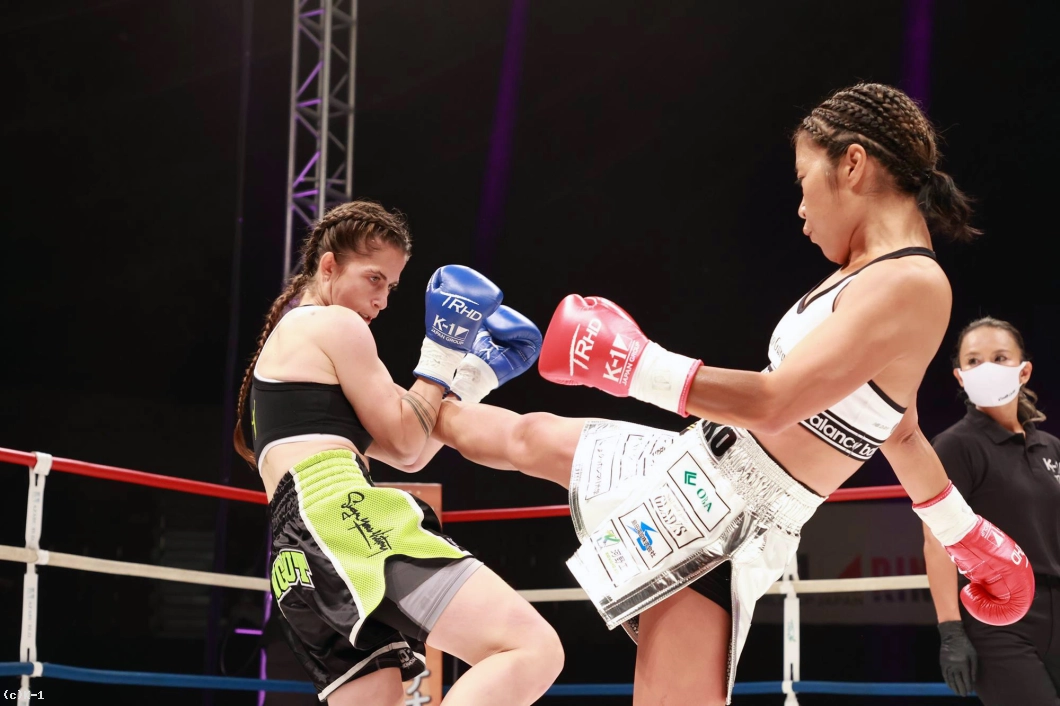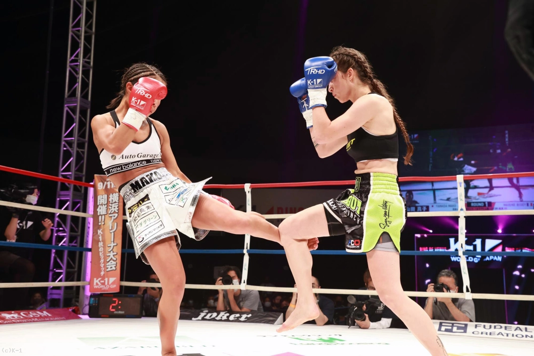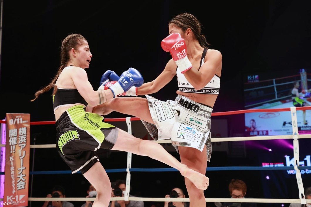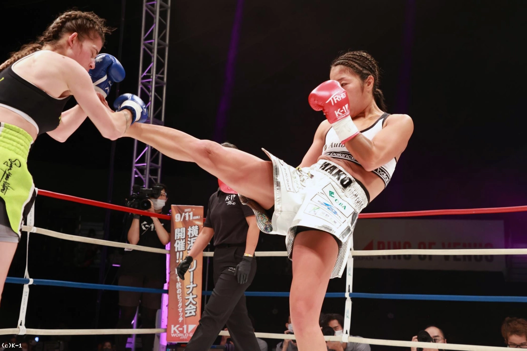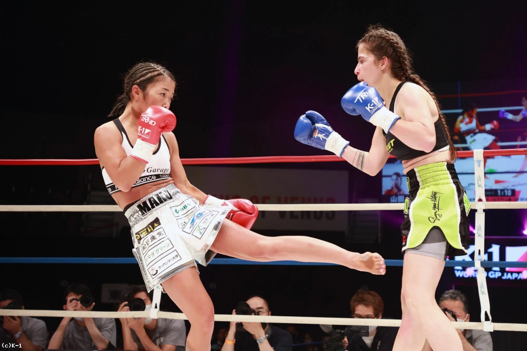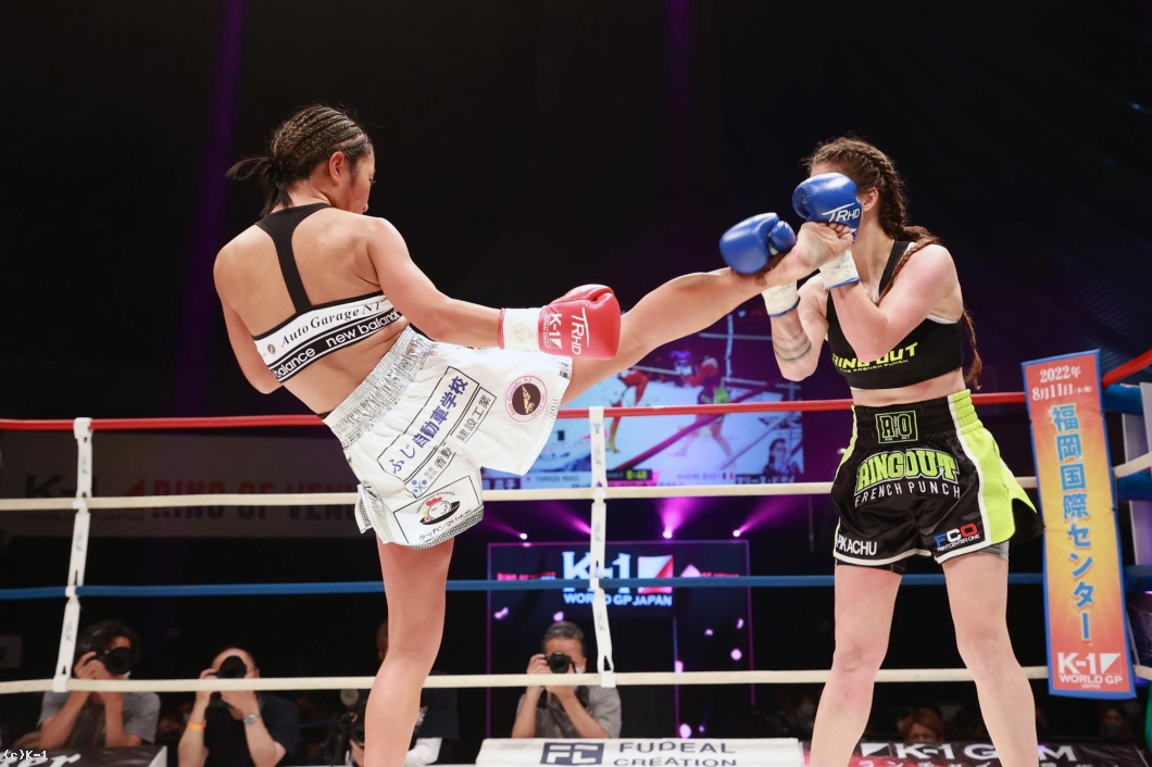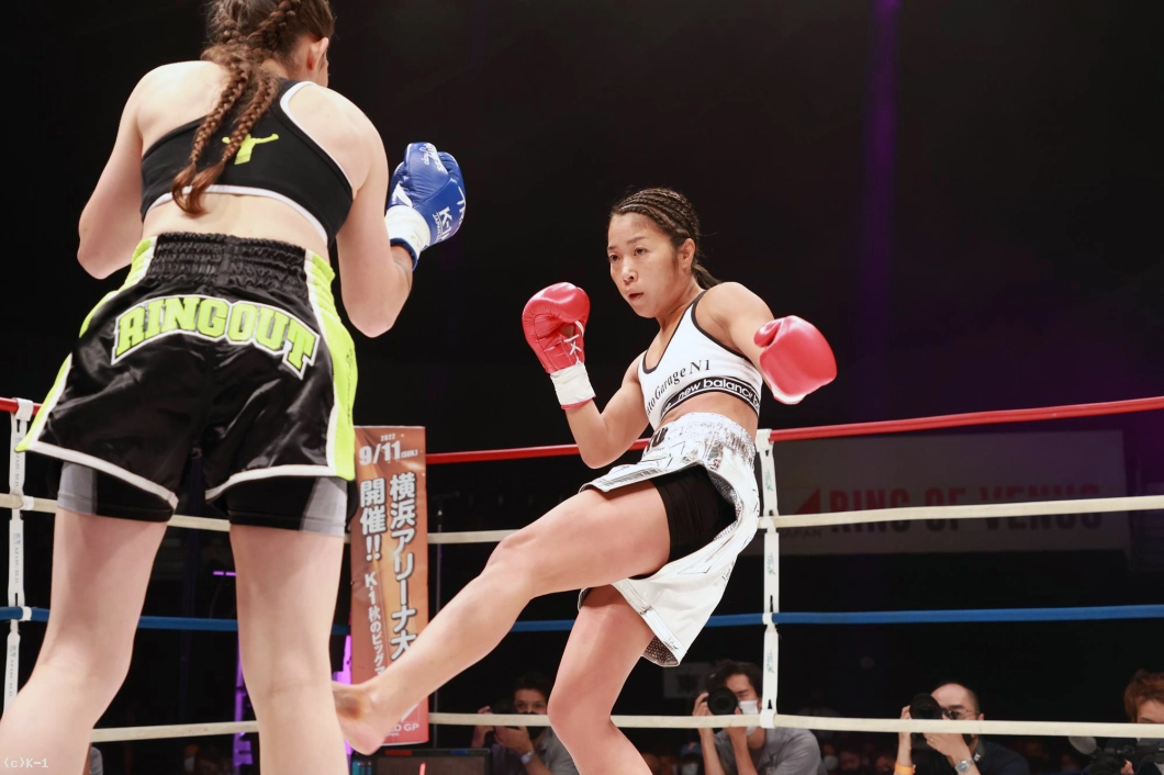 (対戦相手の印象は?)蹴りが強かったです。(相手のどのへんに強さを感じた?)サウスポー対策はしっかりしてきてたんですけど、実際にやってみると距離感も違って。本当に蹴りが強かったんで、つえーなって思いました。(外国人だからこそ思ったことは?)そのへんは全然感じなかったんですけど。でも、最後にリスペクトみたいな、よくわからないですけど、英語でしっかりやりとりできたんで、よかったなと思います。いい経験できたなと思います。(ファンの方にメッセージを)今回、初の女子大会で、次タイトルやらしてくれっていうような試合ができなかったんで、なんとも言えないんですけど。まあ、ちょっとずつベルトに近づいていこうと思ってるんで、これからも応援よろしくお願いします」