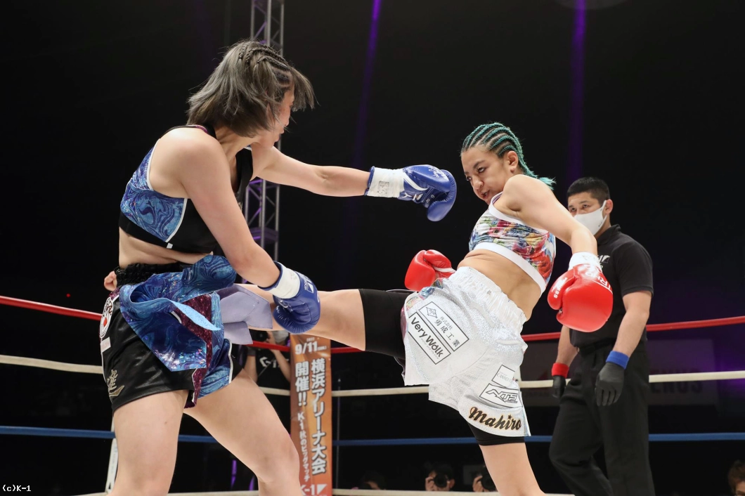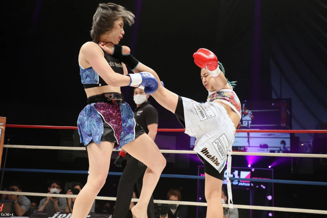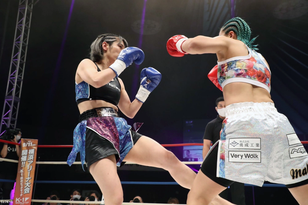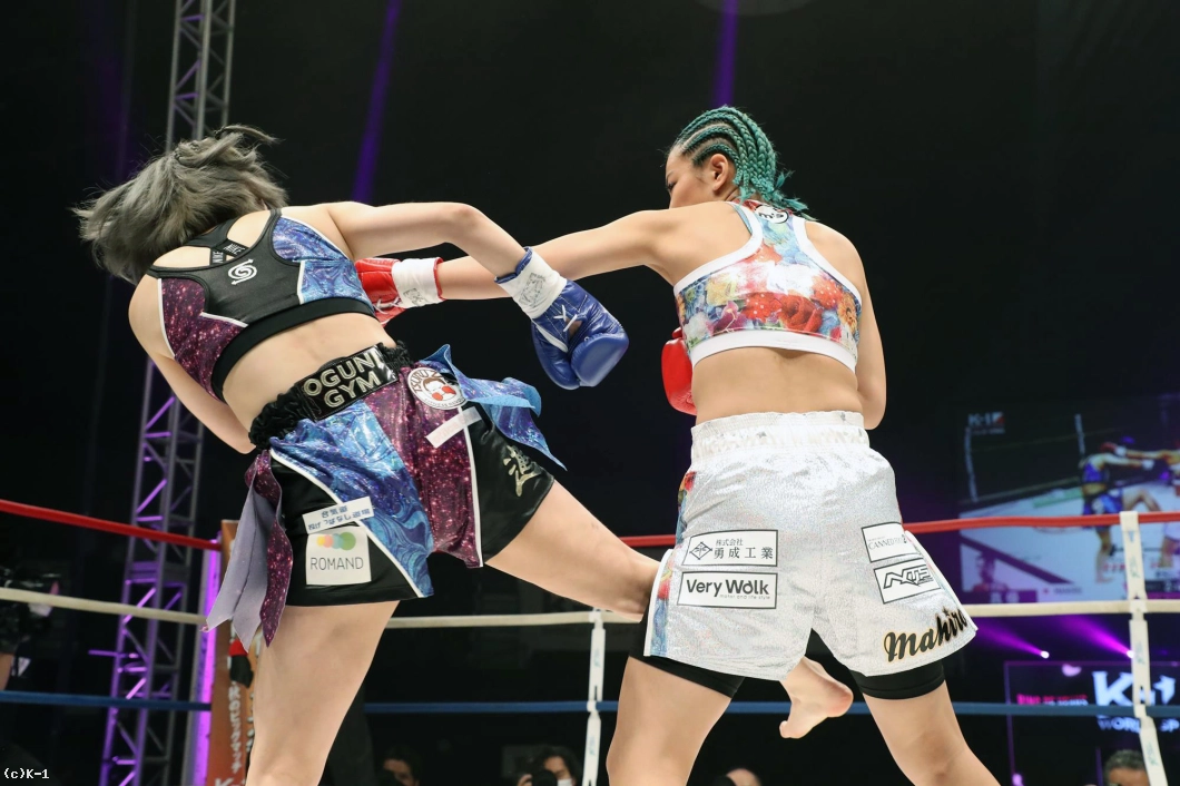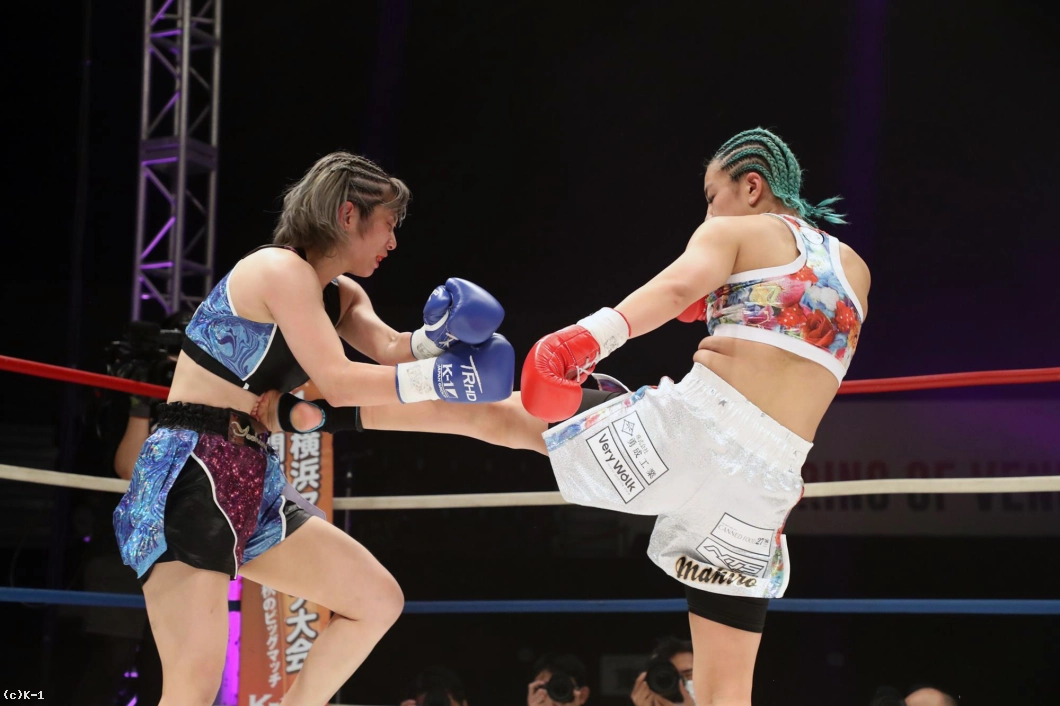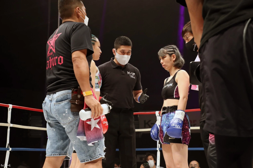 1R、芳美はサウスポーを基本にしながらオーソドックスへのスイッチも織り交ぜ前に出る。だが真優が右ハイキックをヒット。真優は前蹴りを打ち込み、芳美が入ってきたところに左右ストレートをカウンターで当てる。芳美はホールディングが重なり注意を警告を受ける。
