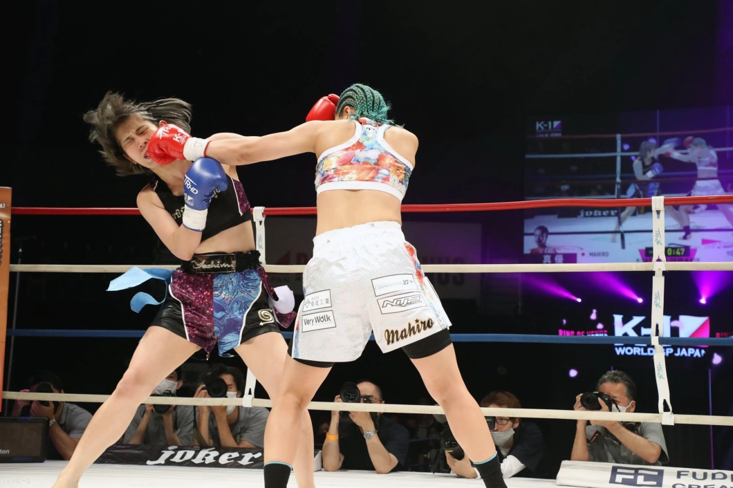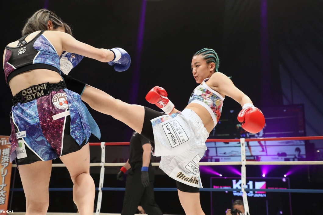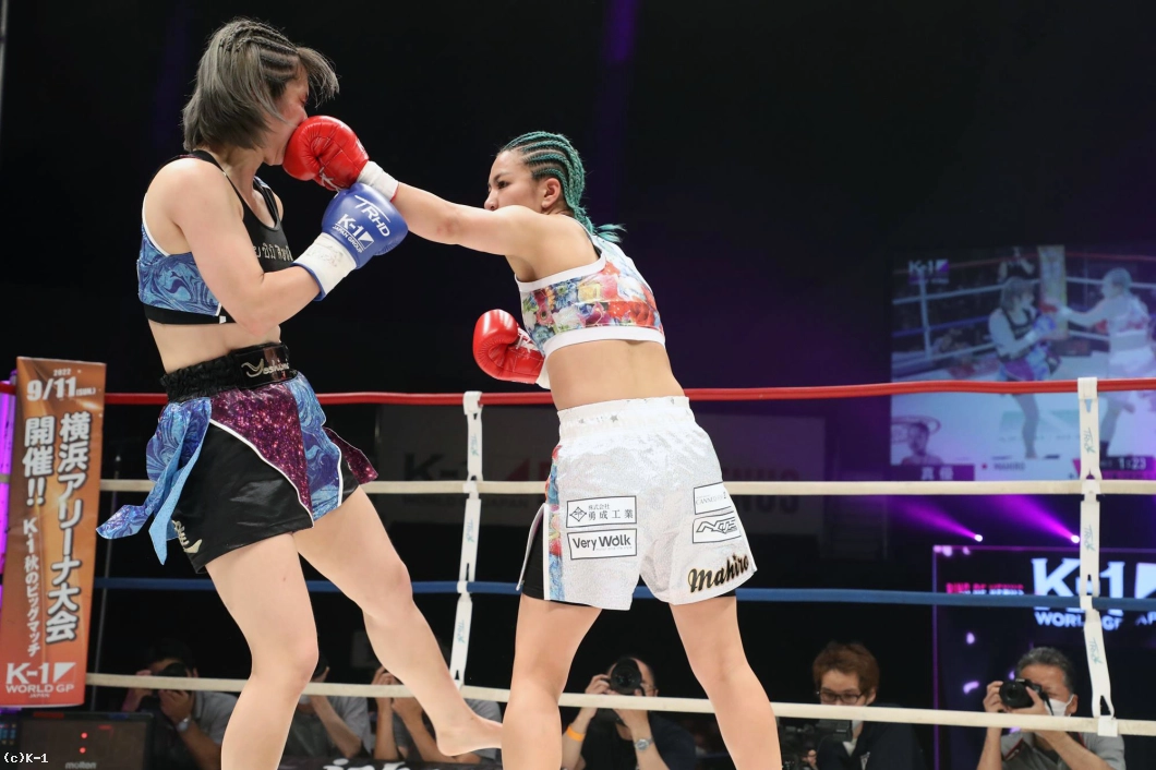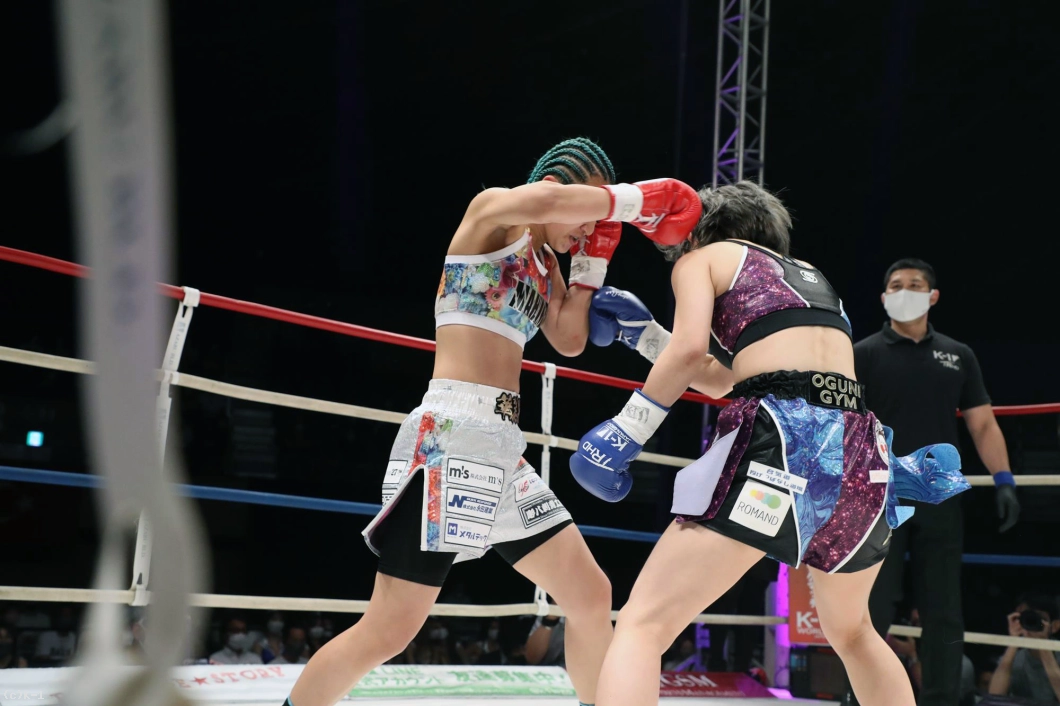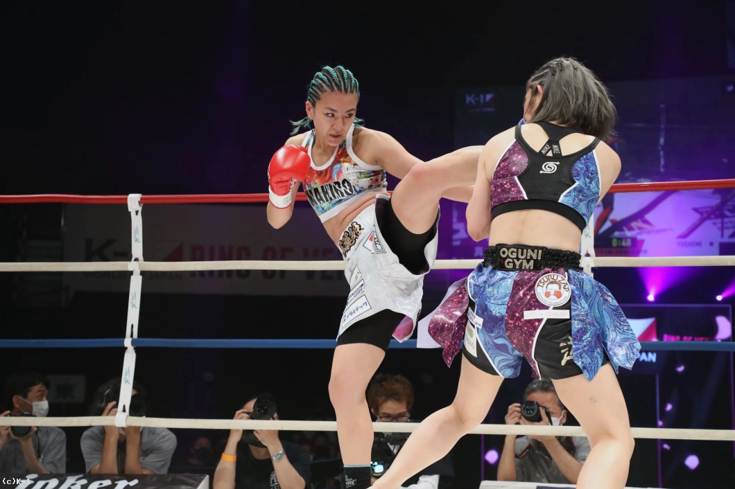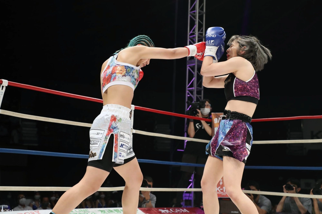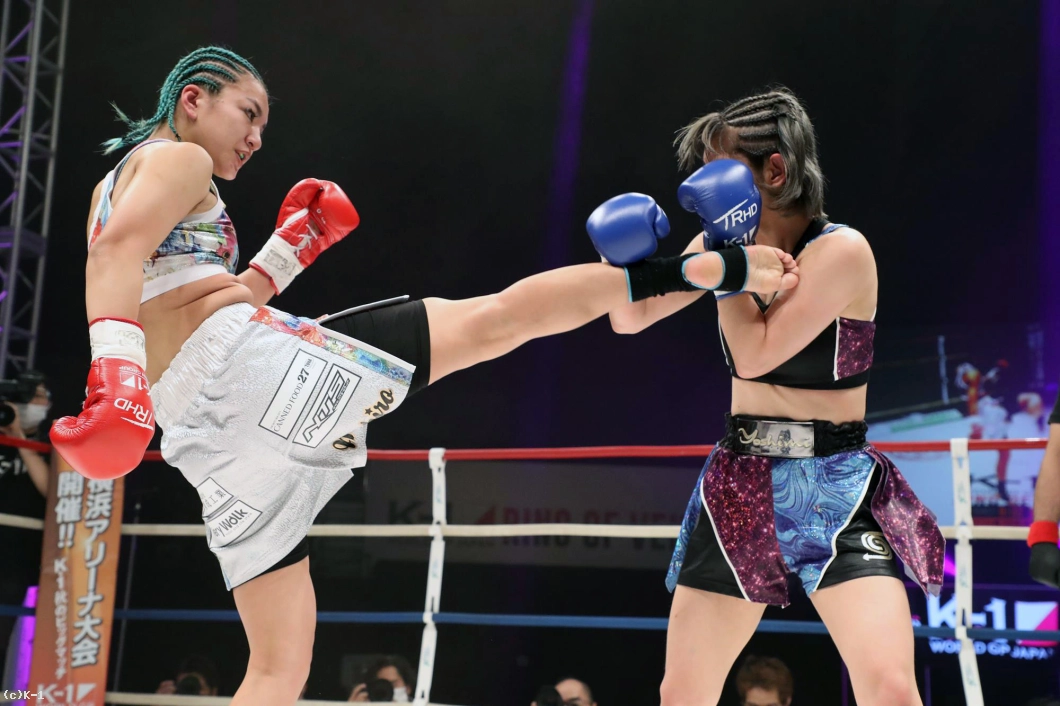 1R、芳美はサウスポーを基本にしながらオーソドックスへのスイッチも織り交ぜ前に出る。だが真優が右ハイキックをヒット。真優は前蹴りを打ち込み、芳美が入ってきたところに左右ストレートをカウンターで当てる。芳美はホールディングが重なり注意を警告を受ける。