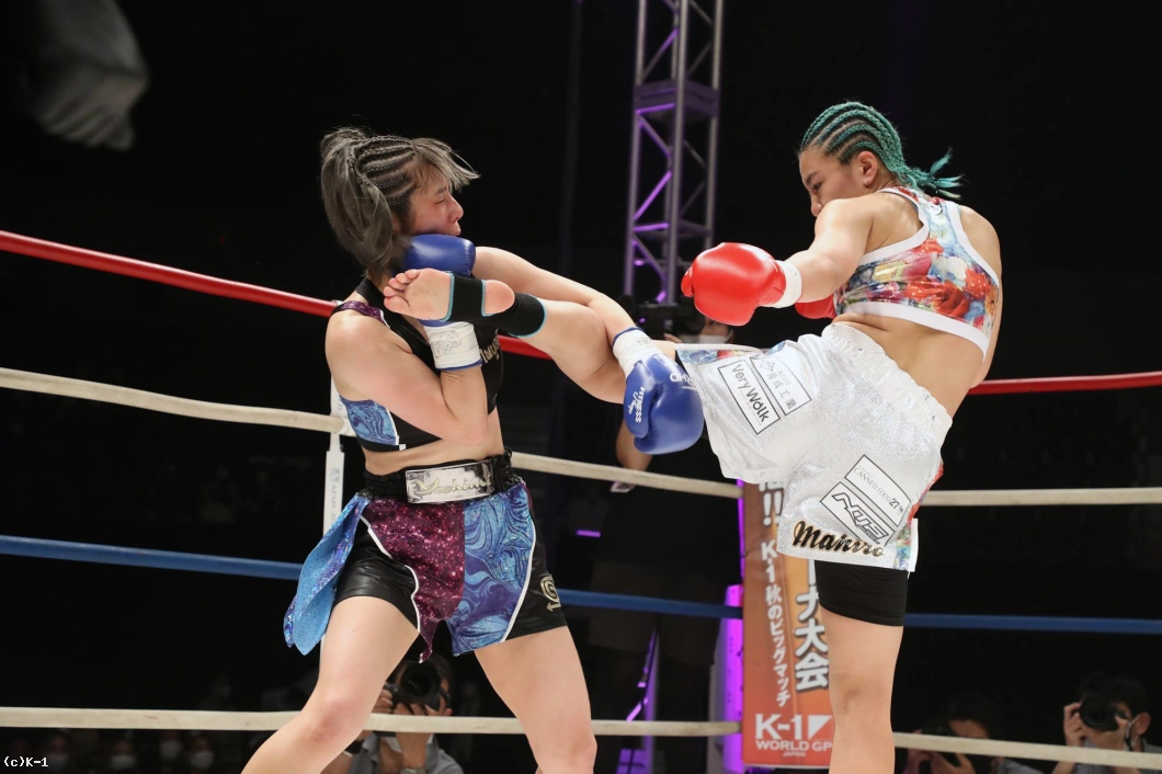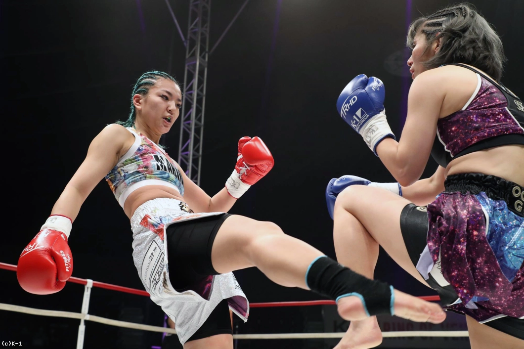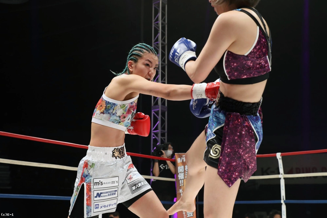 「(試合の感想は?)とりあえず勝ててホッとしてます。K-1に出て自分、初めて勝てて(涙)。いつもK-1に出ると強豪と試合して、大事なとこで負けちゃう自分がいてて。今回、他団体の選手との対決で、踏み台にされるためにここの舞台におるんじゃないというのをアピールしたかったんで、とにかくしっかり勝ててよかったです。(相手の印象は?)芳美選手はやっぱりベテランさんで、すごく気も強いのは知ってたし、その圧も感じたし、パンチ、キックもすごい強かったっていう印象です。(勝利のために一番やってきたことは?)自分は今2連敗しとって、次負けたら3連敗やったんで、ホンマにここを抜けないと自分も成長できんと思ってたし、やっぱり自分の一番の弱さは気持ちの弱さやったんで、そのメンタル面の強さをすごく強化してきたし、自分に自信持てるような練習やったり、フィジカルのサーキットも、ホントにつらいほどしましたね。