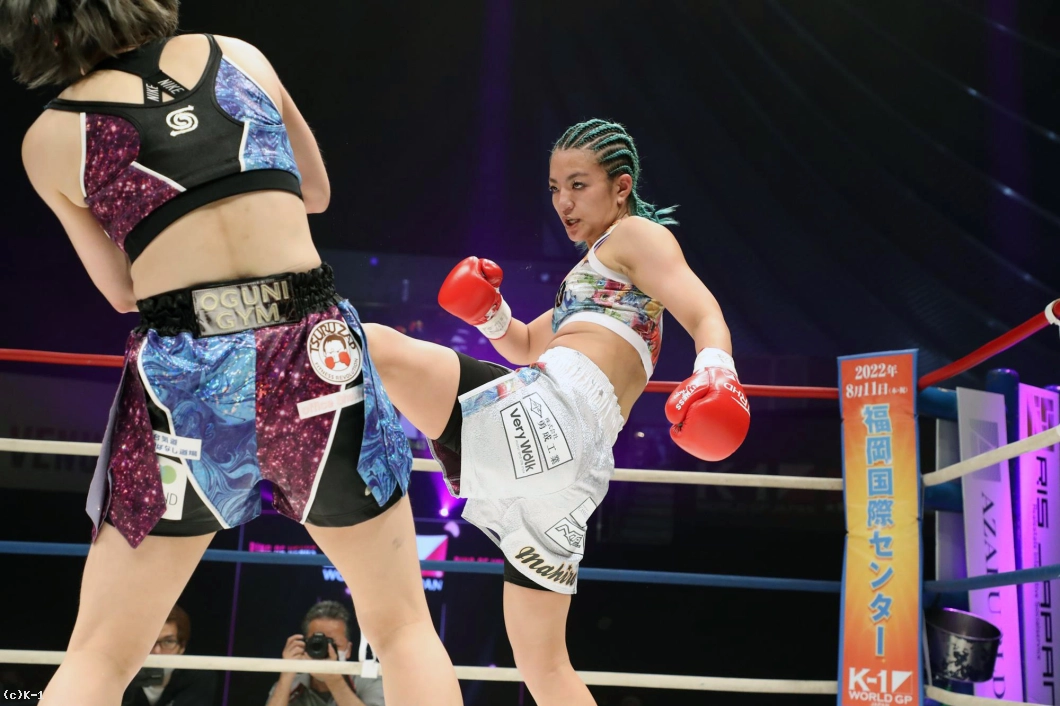 (メンタルの強化というのは具体的には?)ホントに試合で楽しめるということをテーマにしとったんで、楽しめるぐらい練習もしっかり追い込んどったし、何よりフィジカルで、しんどいサーキットがあるんですけど、それを見てくれてる先生が『ホントに真優は自分に自信がなさ過ぎる』と言うので、それを意識して練習してました。(前に出る、強い攻撃を出すという点で手応えは?)一発一発、倒せるパンチや蹴りを、師範や自分の兄貴たちがしっかりミット持ってくれたりとか教えてくれたりとか、それを試合で出せるように、すっごい一生懸命になって教えてくれたんで、それがちょっと見せれたかなって思います。