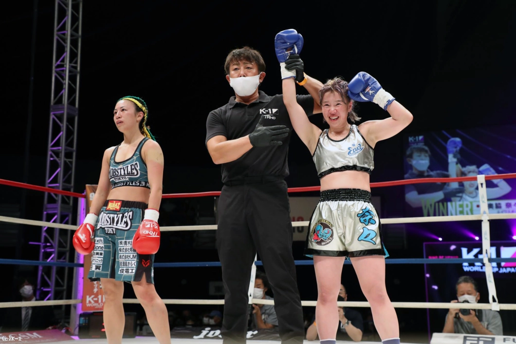 (ファンの方にメッセージを)今回は初参戦させていただいて、勝つことができてよかったです。今回初参戦だったので、少しでも奥脇奈々という名前をK-1、Krushのファンのかたに覚えていただけたらいいなって思ってます。これからもがんばっていきたいと思います、ありがとうございました」