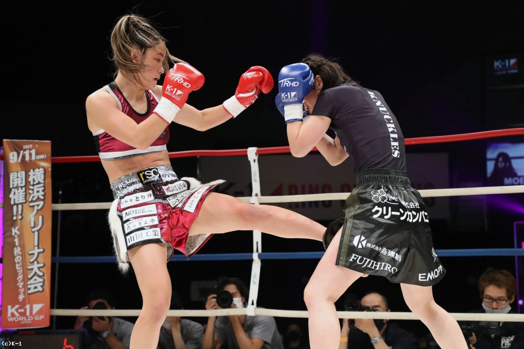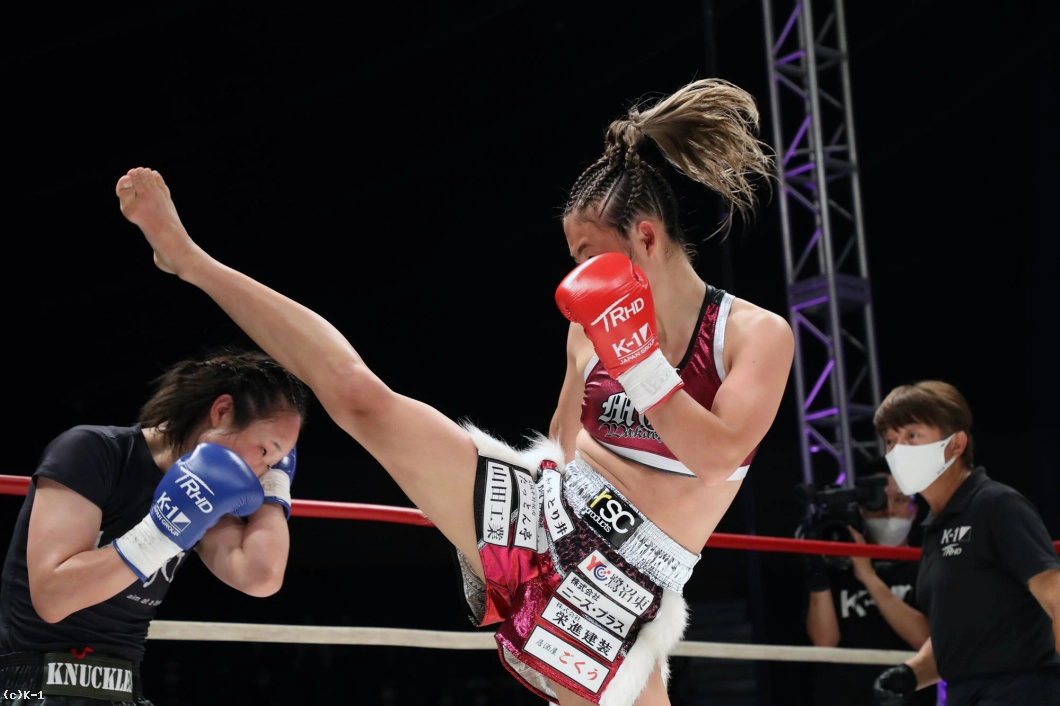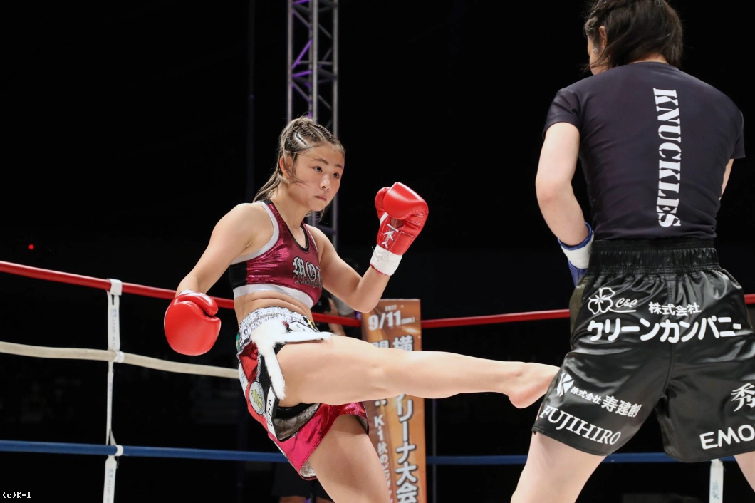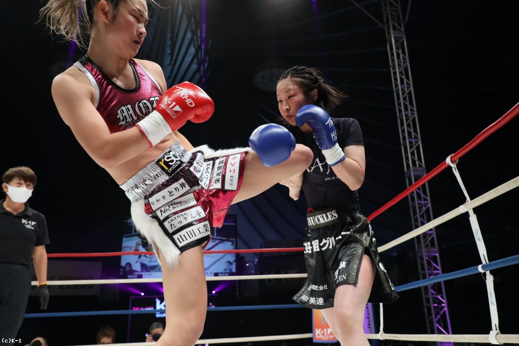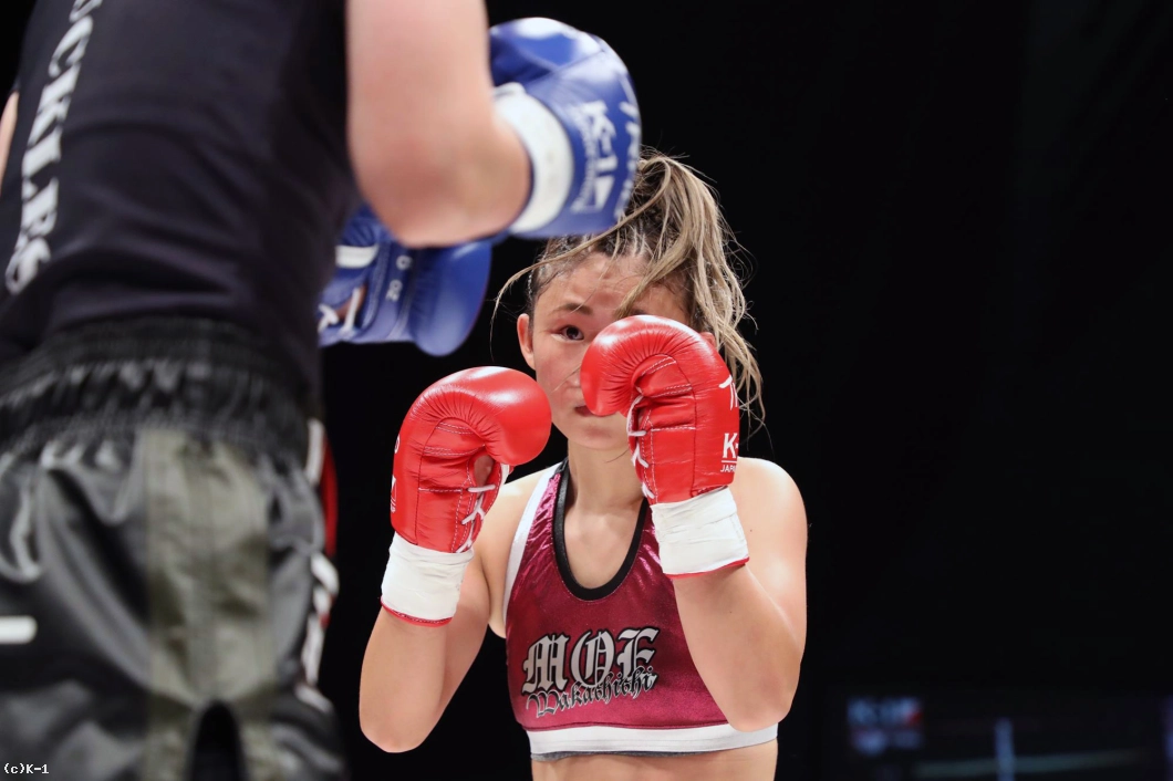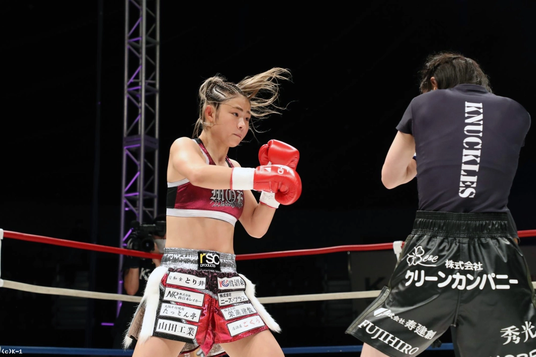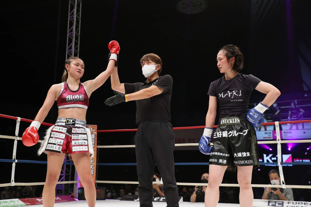 「(試合の感想は?)MARI選手、もっとトリッキーな選手かと思ってたんですけど、意外と正直な戦い方なんかなあと思いました。(相手の印象は?)カーフキックみたいな、ローキックみたいなんが強かったなあと思いました。(勝負のポイント、よかったところは?)延長でしっかり蹴りも出せたことと、セコンドの声、いつも応援してくれる、サポートしてくれてるみんなの声を聞きながら動けたのが一番よかったと思います。(ファンの方にメッセージを)今日は応援してくれてありがとうございました。遠い大阪から足を運んで会場で応援してくれたみんな、生中継で応援してくれてたみんな、ありがとうございました。勝てました。ありがとうございます」