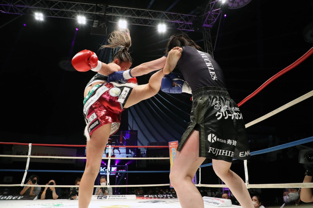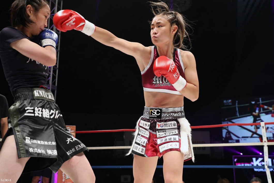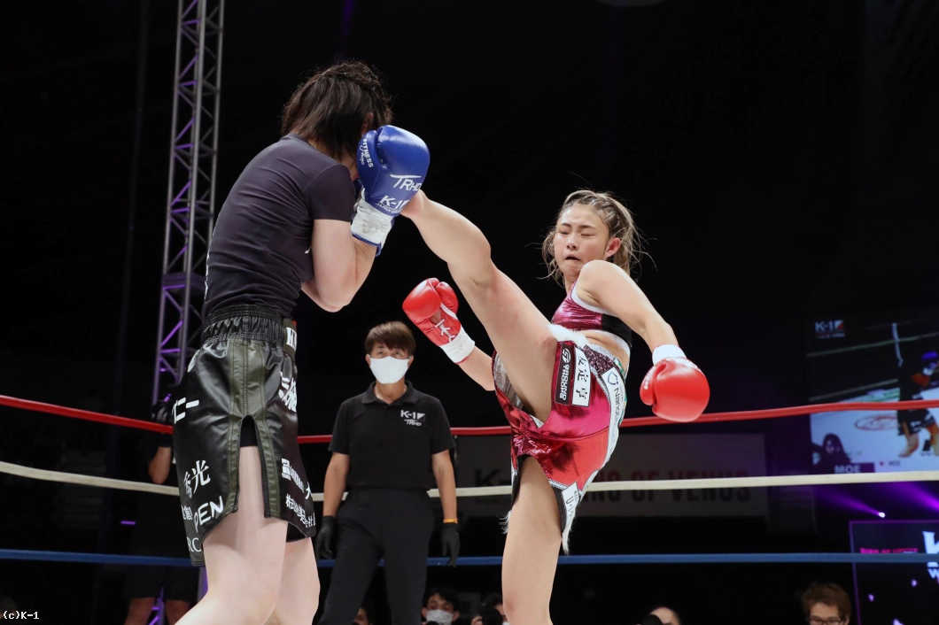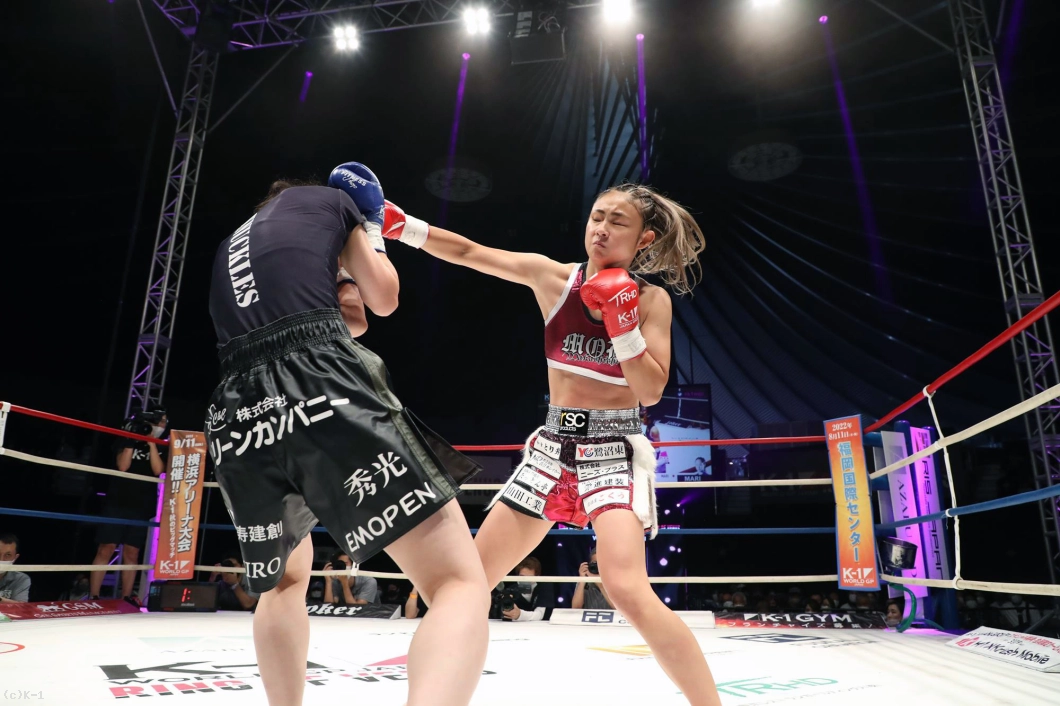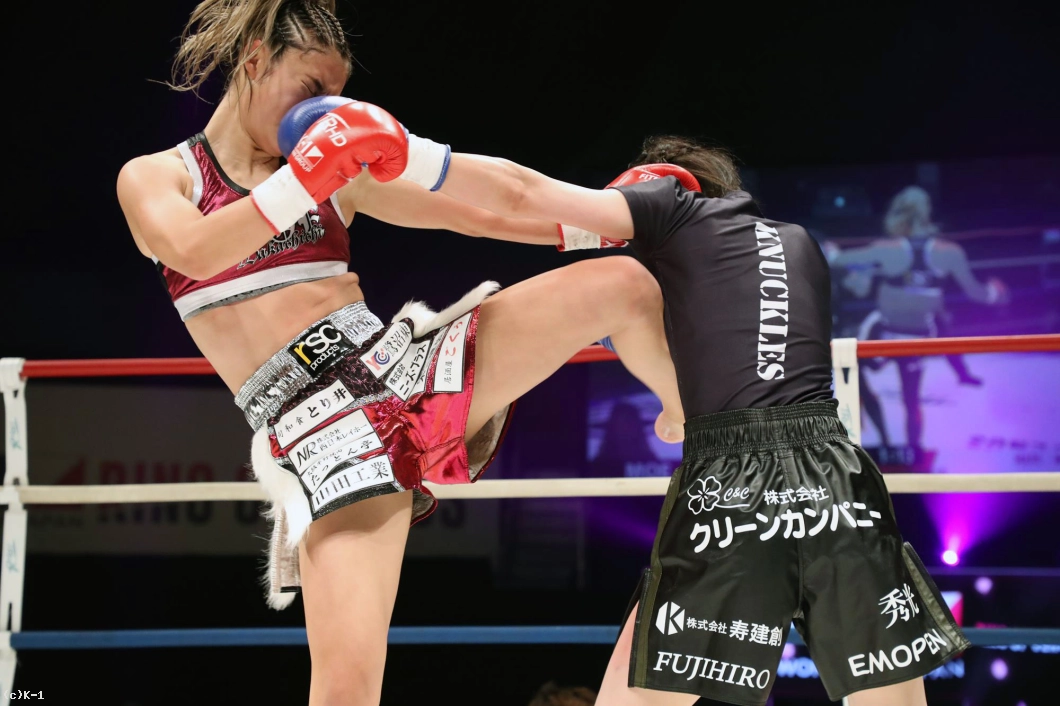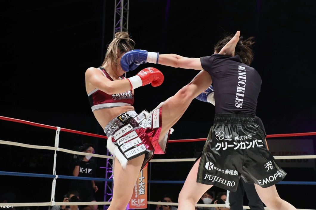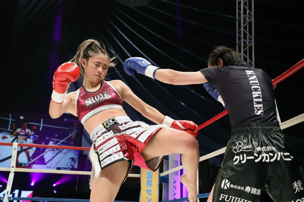 「(試合の感想は?)MARI選手、もっとトリッキーな選手かと思ってたんですけど、意外と正直な戦い方なんかなあと思いました。(相手の印象は?)カーフキックみたいな、ローキックみたいなんが強かったなあと思いました。(勝負のポイント、よかったところは?)延長でしっかり蹴りも出せたことと、セコンドの声、いつも応援してくれる、サポートしてくれてるみんなの声を聞きながら動けたのが一番よかったと思います。(ファンの方にメッセージを)今日は応援してくれてありがとうございました。遠い大阪から足を運んで会場で応援してくれたみんな、生中継で応援してくれてたみんな、ありがとうございました。勝てました。ありがとうございます」