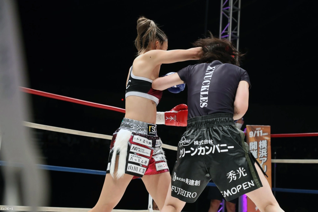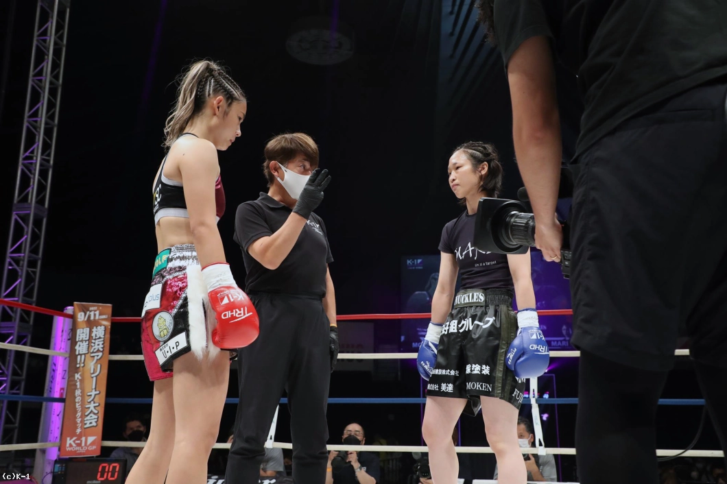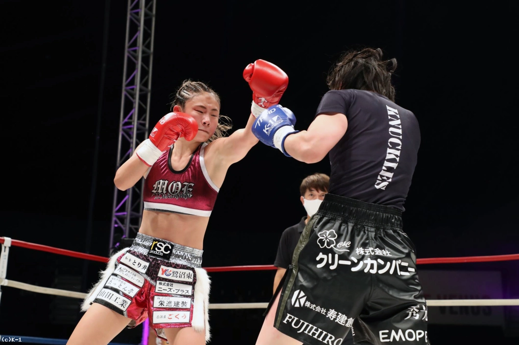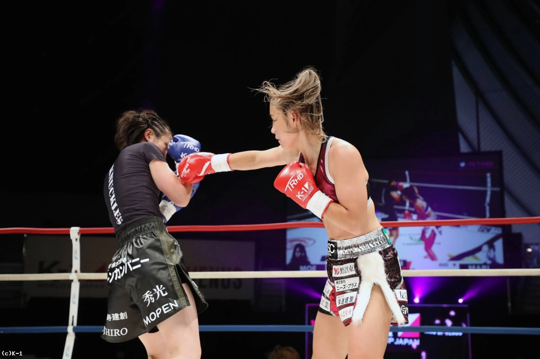 延長R開始とともにMARIは前進を強め、パンチからミドル、バックブローと繋げる。押されるMOEだがパンチからミドル、前蹴りに繋げて反撃。MARIは再びバックブローを放つが肘部分が入ってしまい注意が与えられる。再開から前に出たMOEはミドルとハイキック。顔面前蹴りを放ってMARIをとらえる。判定は3者10-9でMOE。K-1初白星を上げた。