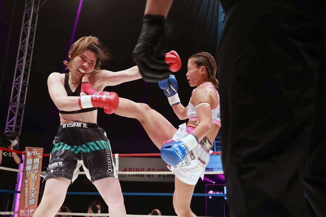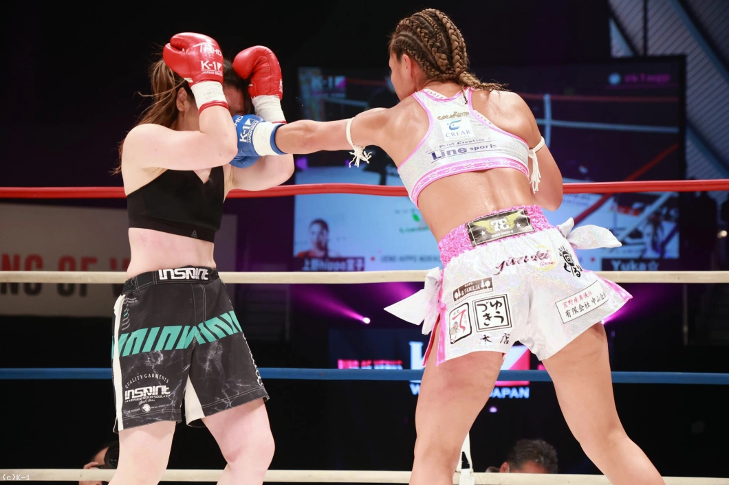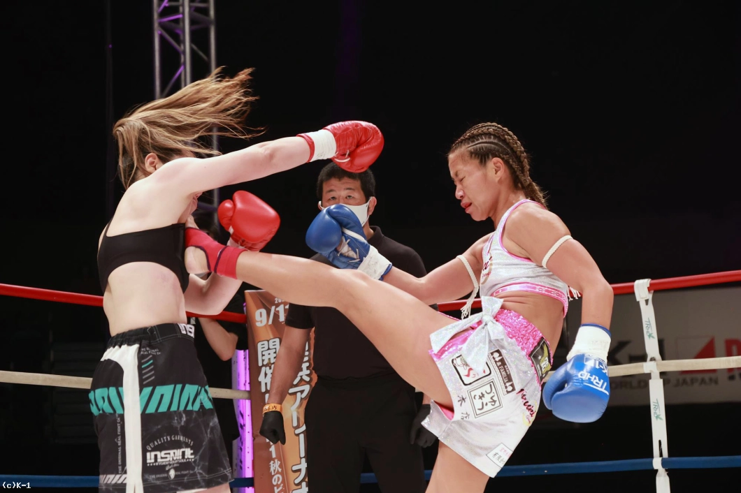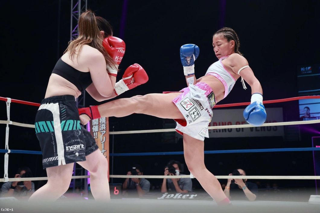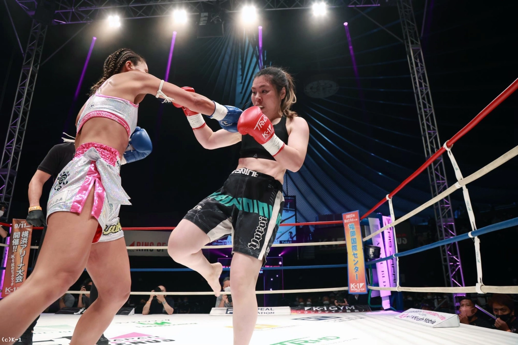 (昨日、同門のerika♡選手も勝って、いい形につながりましたが)そうですね。今日も応援に来てくれて、サポートしてくれていい流れにつなげてくれたので、勝つことができてよかったです。(大きい大会で結果が出て、これからK-1で目指すところは?)まだミニマム級のベルトがないので、そこを狙ってしっかり倒せるように練習していきたいと思ってますし、自分はパンチが一応得意ではあるので、そこを極めて、しっかりKOを狙っていける選手になりたいと思います。