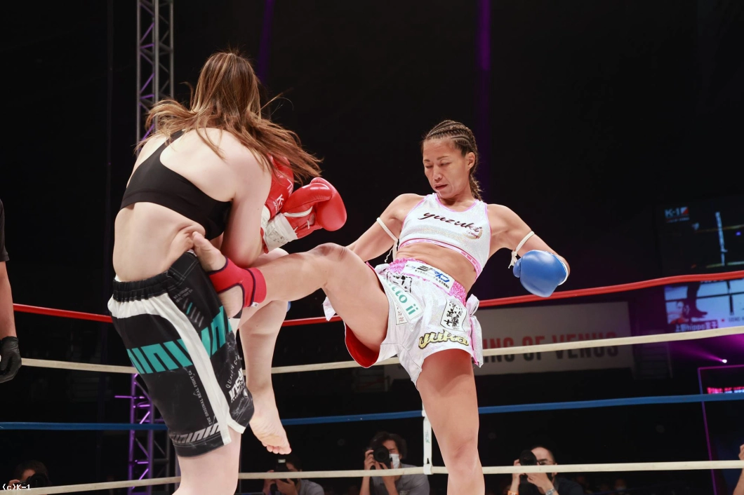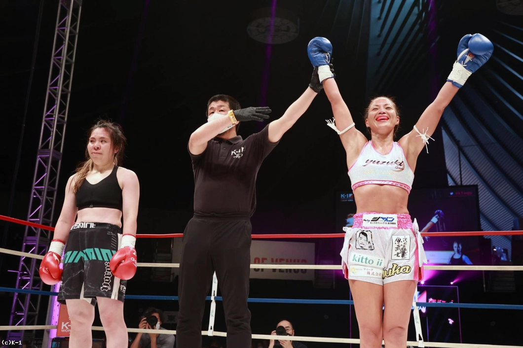 3R、Yuka☆はヒザ蹴りの際に相手を掴んでしまい注意が与えられる。上野はペースを落とさず、また攻め方も変えず左フックと右ストレート、ローでの攻勢を続行。Yuka☆は上野のパンチを受けた後で左フック、右ストレートを返しヒットを奪う。ハイキックを繰り出す上野だがこれはもう少しで届かない。Yuka☆は右ロー、ボディへのヒザ、左右連打を追加して終了する。判定は30−28、30−28、30−27の3−0でYuka☆。フルマークの判定勝ちを果たした。