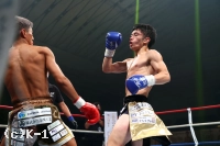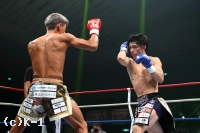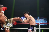 2R、黒田のストレートを注意し、壬生狼は右手のガードを上げて前進していく。右ミドルを当ててさらに詰める壬生狼だが、黒田は身を低くして組みついてくる。