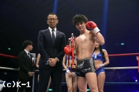 「応援ありがとうございます。地元大阪のみなさん、お久しぶりです。3年ぶりぐらいで試合をして、K-1では初、K-1大阪出させてもらって、KOで勝つことができてよかったです。9月負けてしまって、タイトル遠のいたと思うんですけど、金子選手次の試合に出てくると思うんですけど今日は勝ってもらって、3月K’FESTAでタイトルマッチよろしくお願いします。コンペット選手に権利があるのは分かってるんですけど、3月やって、タイトルマッチでリベンジするのでこれからもよろしくお願いします」