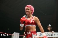 「会場、ABEMAで応援してくださったみなさん、応援ありがとうございます。K-1チャンピオンが世界で一番強い、それを証明し続けたいと思います。今の目標はONEにいるアニッサ(・メクセン)選手と戦うことです。K-1が世界で最強ということを女子を先頭に引っ張っていきたいと思います。スポンサーのみなさん、指導してくれる大宮司さん、ジムのみなさん、ファンのみなさん、ありがとうございました。K-1最高!」