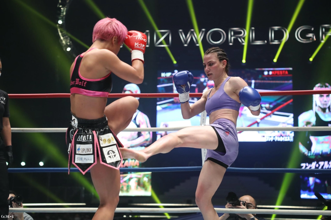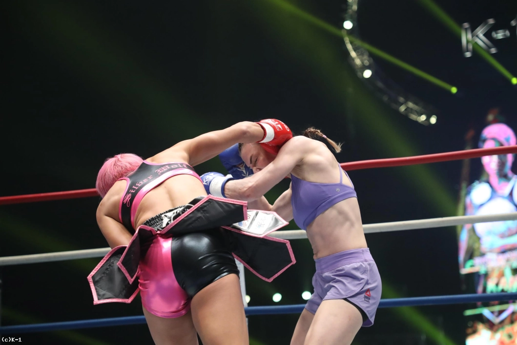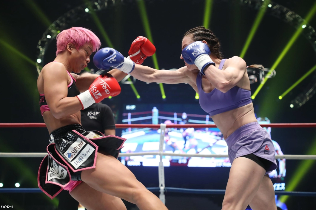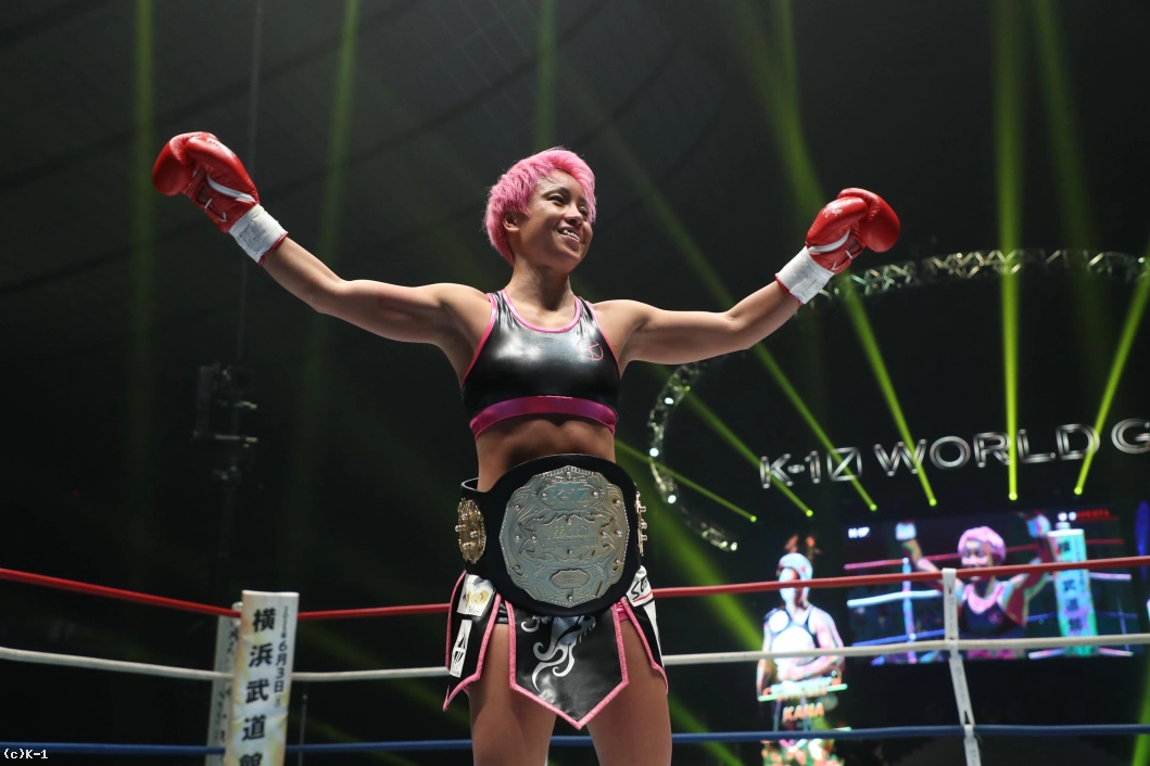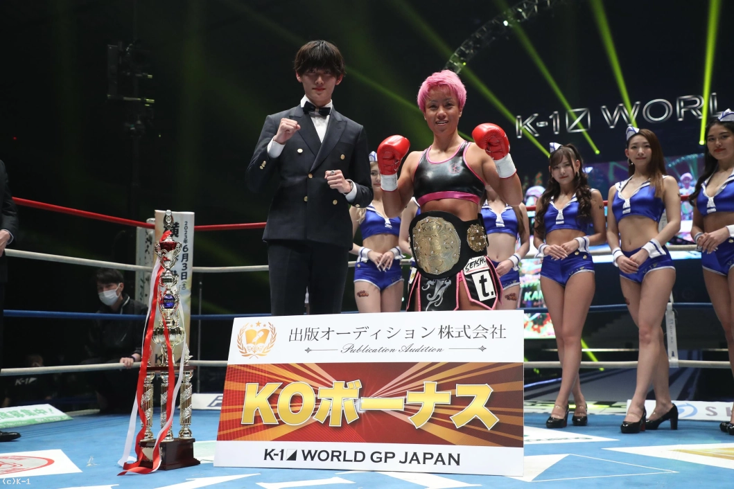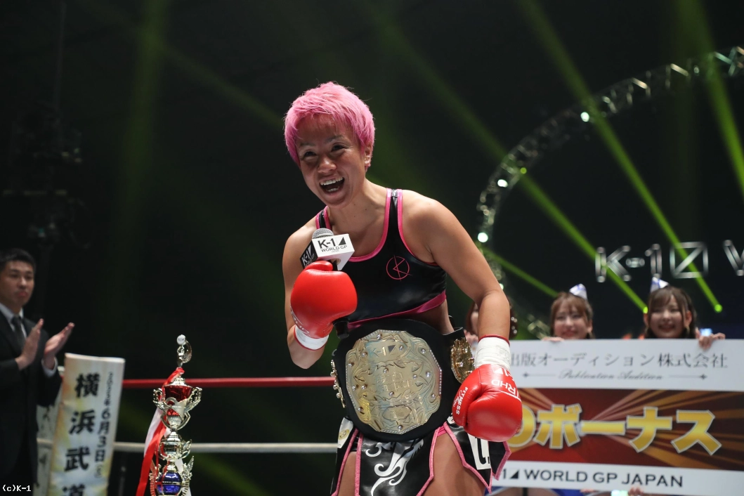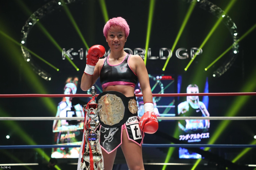 「フンダ選手、対戦してくれてありがとうございます。自分を成長させてくれるみなさん、ありがとうございます。応援してくれるみなさん、ありがとうございます。(菅原)美優ちゃん、おめでとう! 第一部のメインでKOで倒せたことは嬉しいです。でも自分が目指しているのはここじゃないので、今年アニッサ・メクセン戦を実現させます。自分が世界最強、このベルトが世界最強です。K-1最高!」