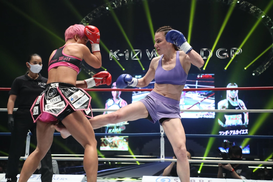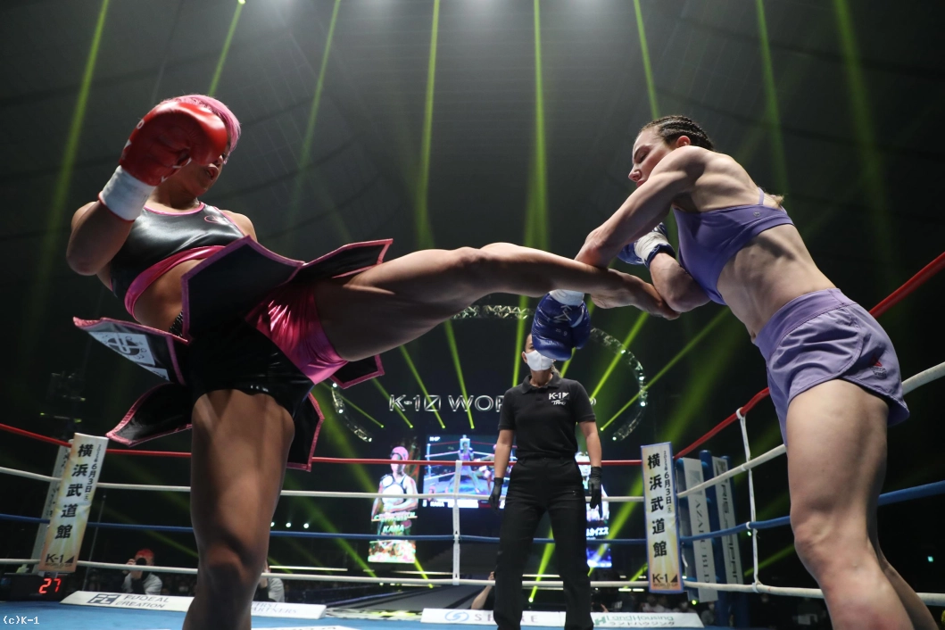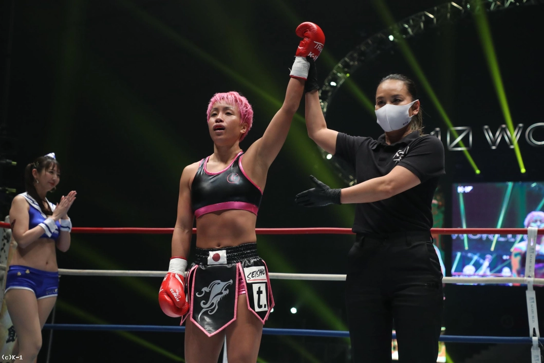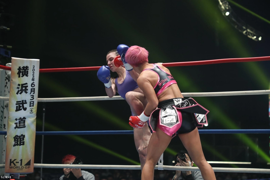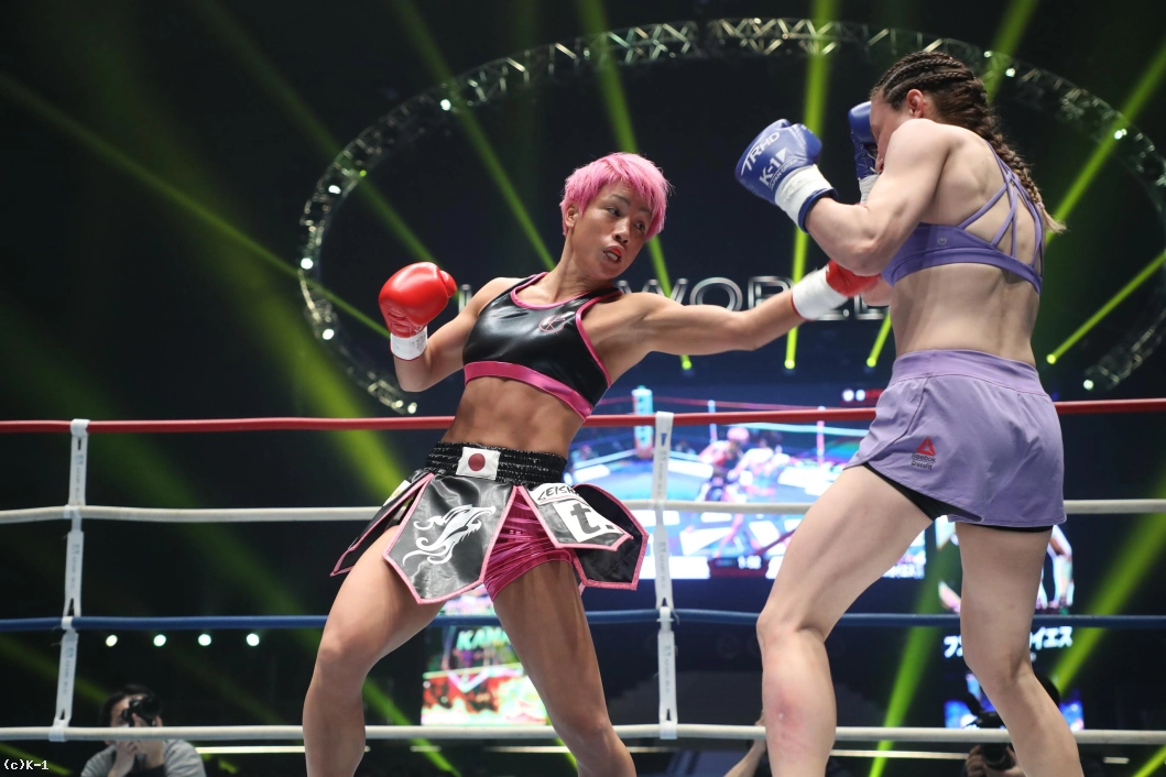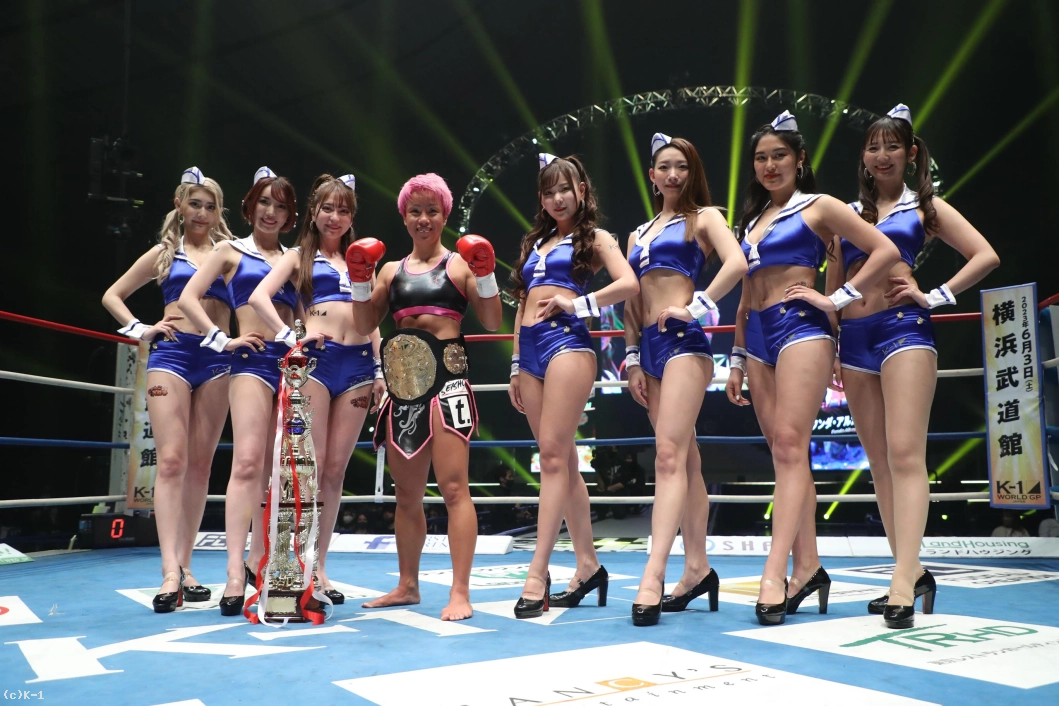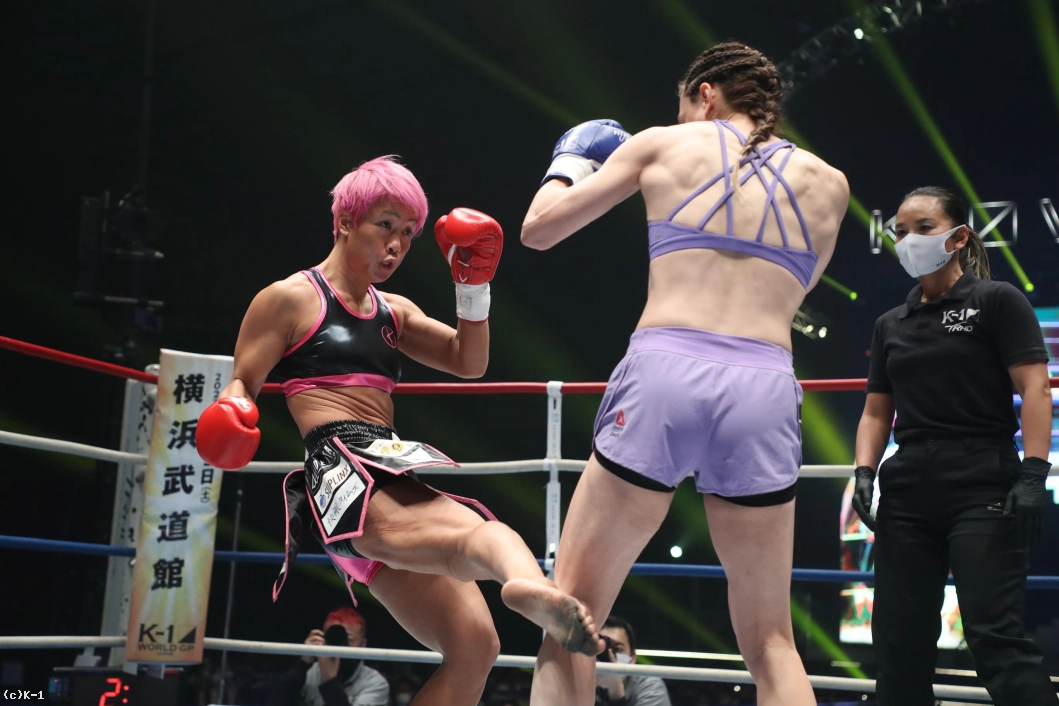 「フンダ選手、対戦してくれてありがとうございます。自分を成長させてくれるみなさん、ありがとうございます。応援してくれるみなさん、ありがとうございます。(菅原)美優ちゃん、おめでとう! 第一部のメインでKOで倒せたことは嬉しいです。でも自分が目指しているのはここじゃないので、今年アニッサ・メクセン戦を実現させます。自分が世界最強、このベルトが世界最強です。K-1最高!」