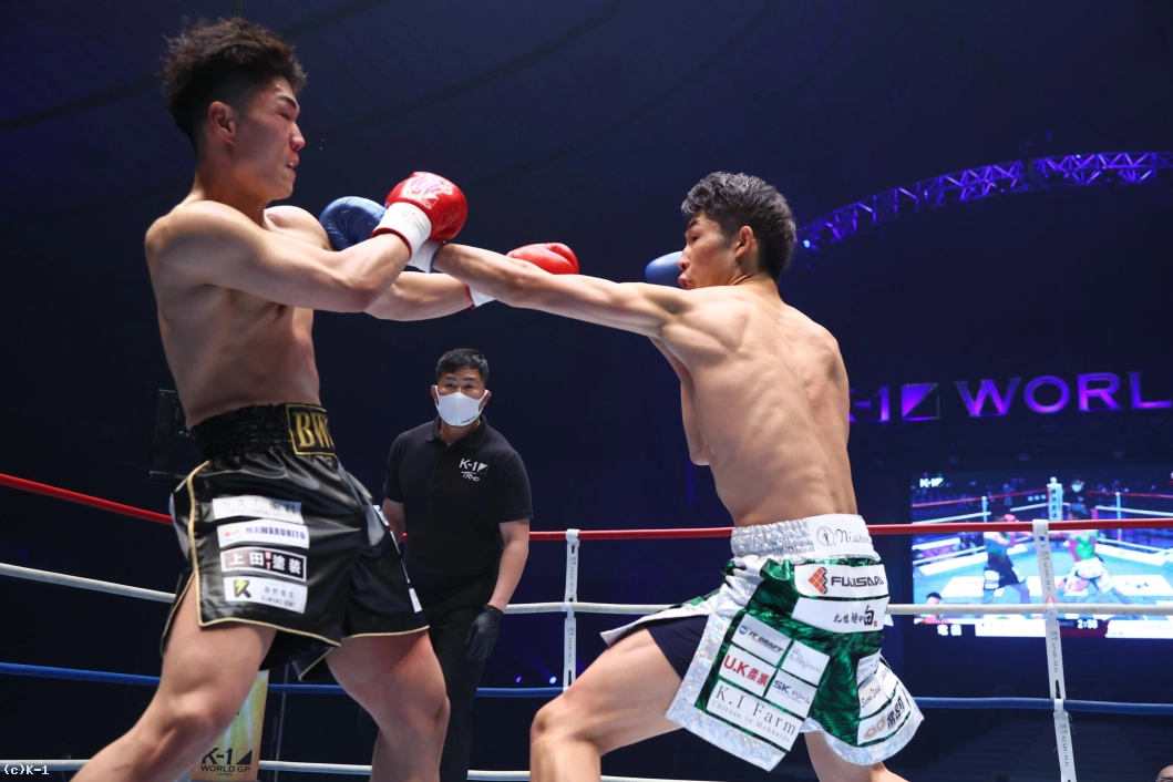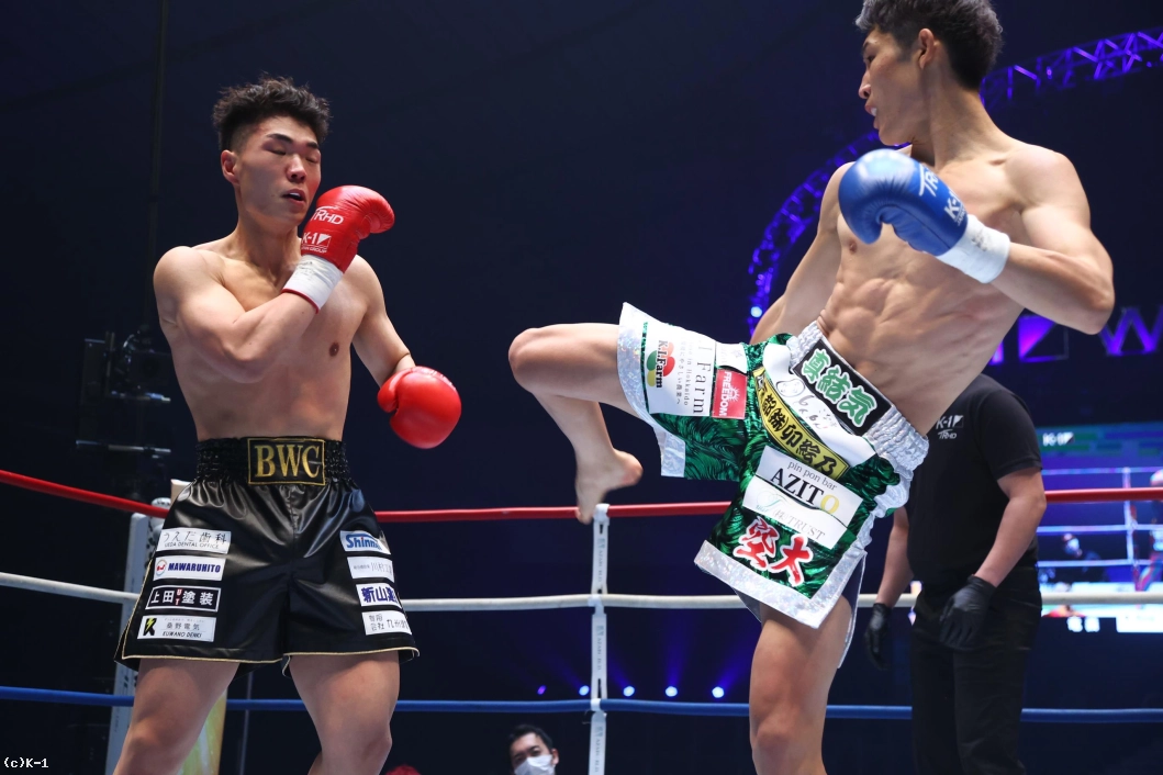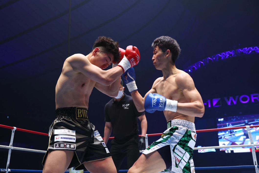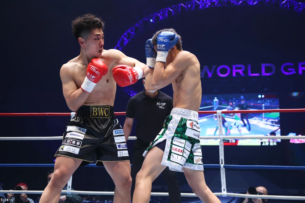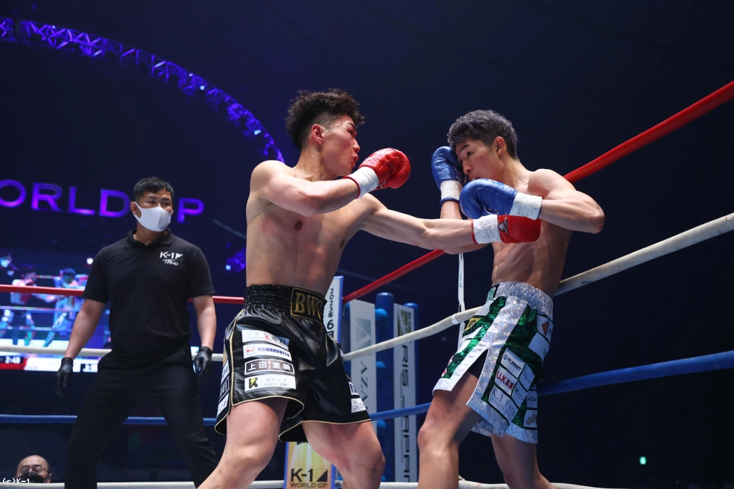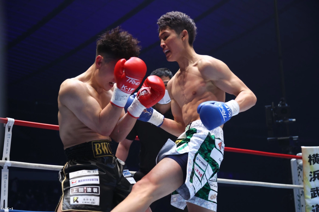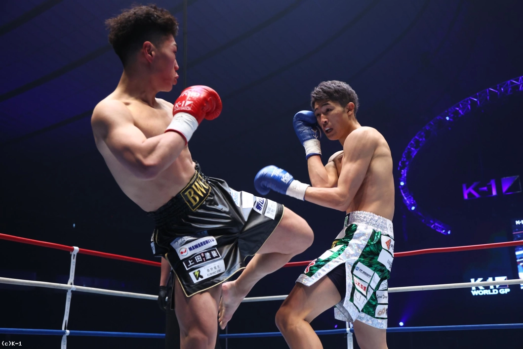 2Rも上野はリーチを活かして距離を保ち、ジャブと前蹴りを飛ばす。竜義も右ストレートをヒット。さらに左フックを当てるが、上野は右ストレート・左フックとパンチを回転させ反撃。上野はボディへのヒザ、三日月蹴りを打ち込んで効かせるが、竜義は間合いを詰めボディフック、左フックと打ち返す。ラウンド終盤はローの上野に左フックの竜義と打ち合いになる。