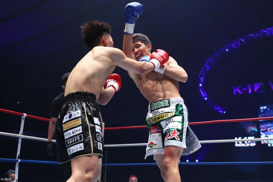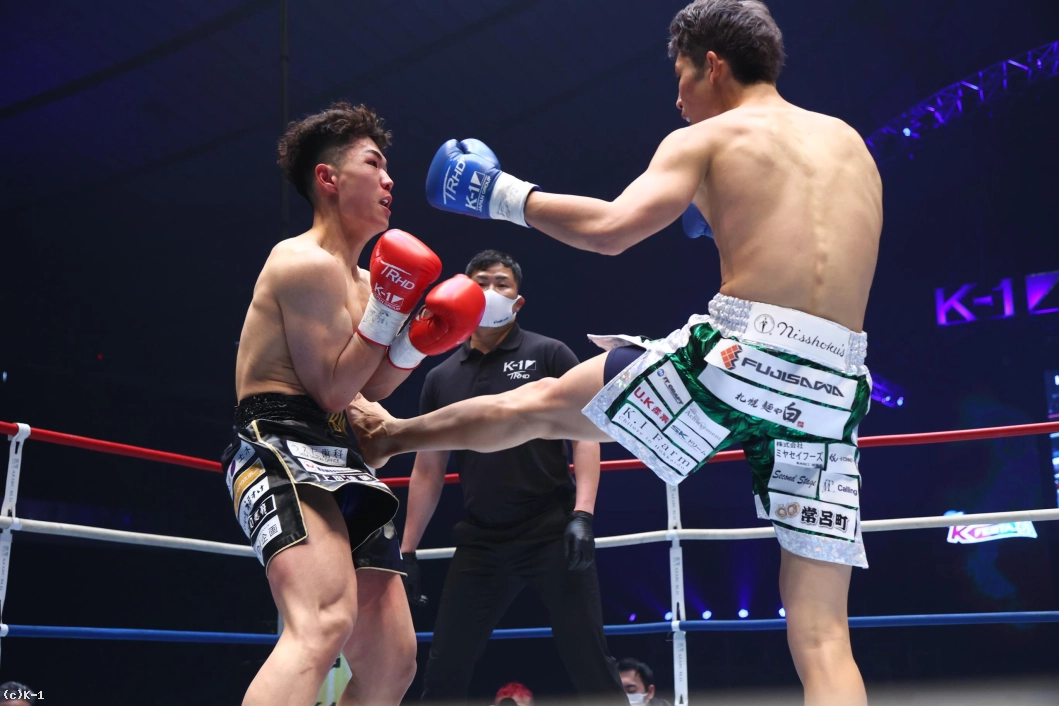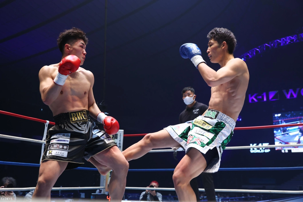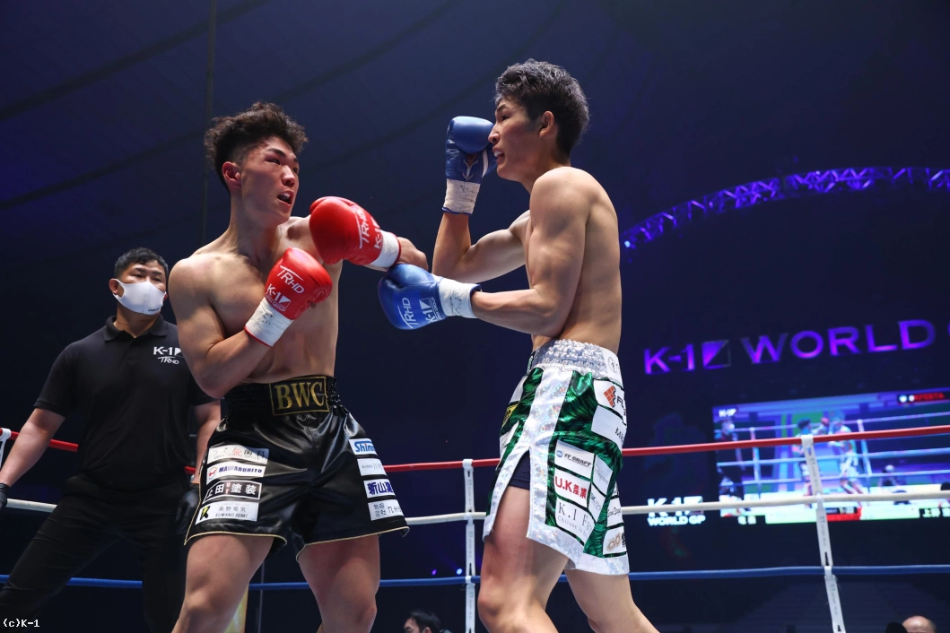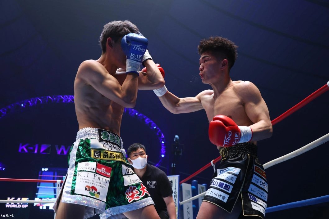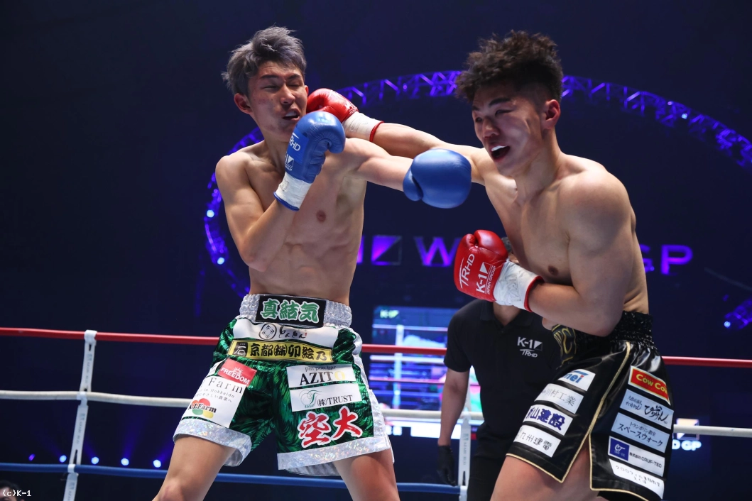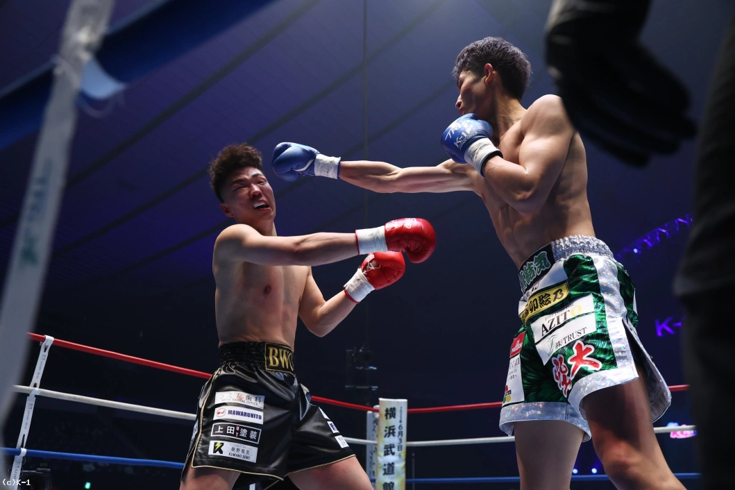 2Rも上野はリーチを活かして距離を保ち、ジャブと前蹴りを飛ばす。竜義も右ストレートをヒット。さらに左フックを当てるが、上野は右ストレート・左フックとパンチを回転させ反撃。上野はボディへのヒザ、三日月蹴りを打ち込んで効かせるが、竜義は間合いを詰めボディフック、左フックと打ち返す。ラウンド終盤はローの上野に左フックの竜義と打ち合いになる。