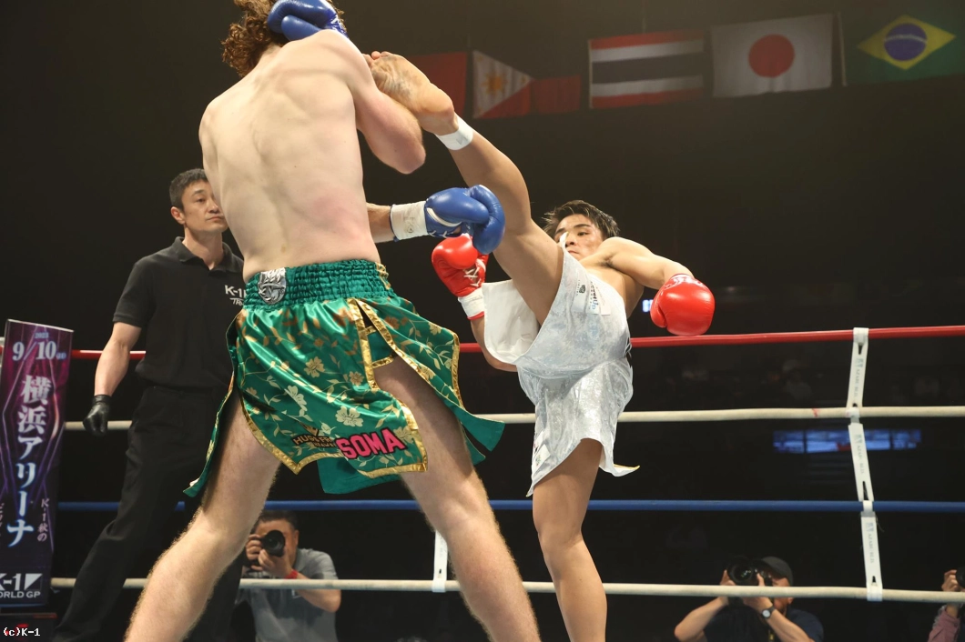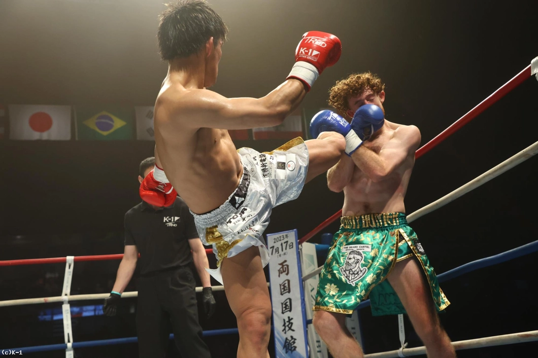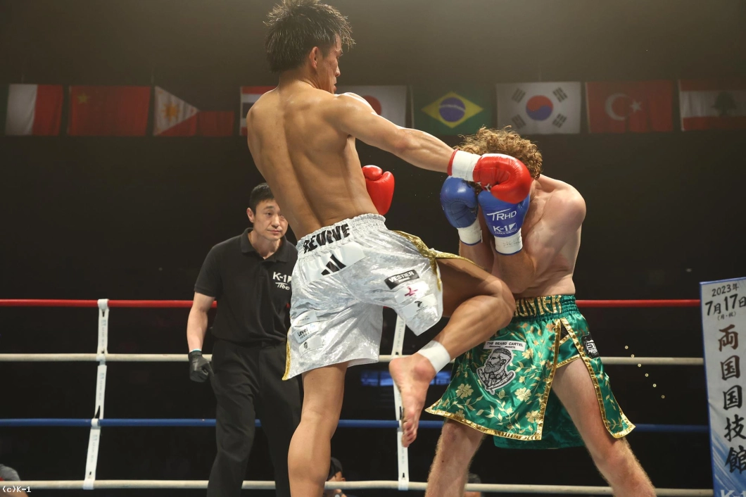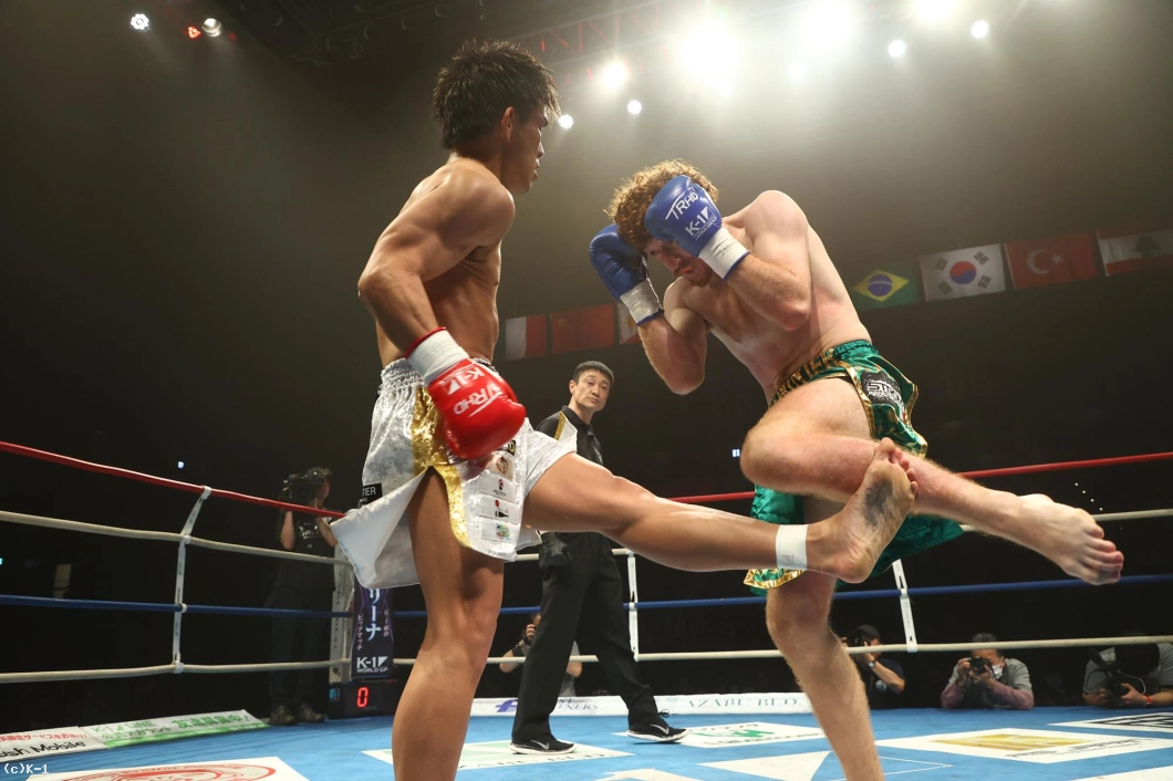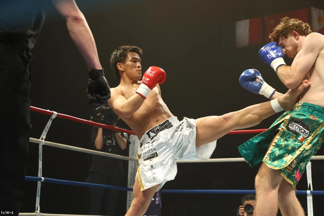 1R、与座がローを入れるが、クラークはコーナーに詰めてフック。しかし与座はこれをブロックし、三日月蹴りでクラークのボディをとらえる。与座はさらに三日月蹴りをボディに決め、飛びヒザ、脚へのカカト蹴り、バックキック、カーフキックとクラークを攻める。与座は攻めを止めず、ハイキック、ミドル、パンチの連打とノンストップで初回を終える。