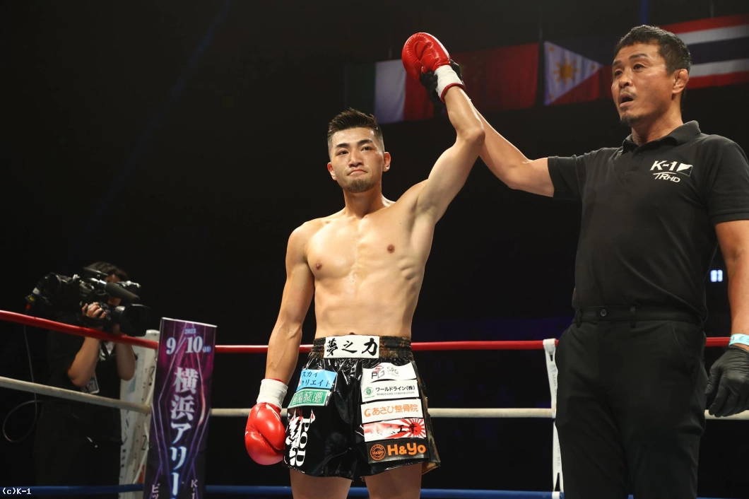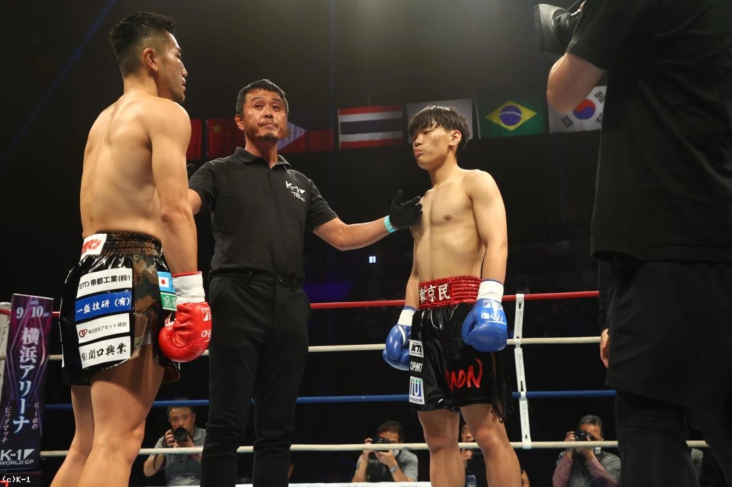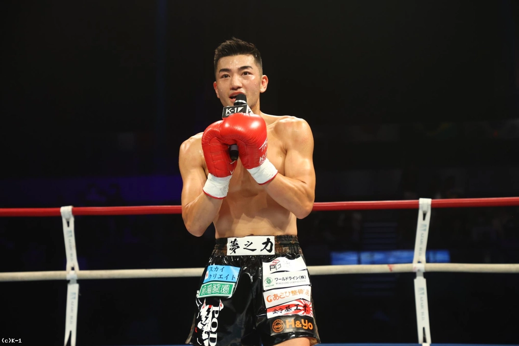「対戦相手のハン・ギョンミン選手、体重オーバーはちょっと悲しかったですが、試合できたことを嬉しく思います。ありがとうございました。Krushでデビューしてやっと初めてK-1に出られました。K-1でもスーパー・フェザー級チャンピオンになれるよう頑張りますので、応援よろしくお願いします」