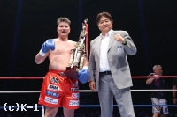 「K-1ファンのみなさん、始めまして。初戦がダメで硬すぎて、いつもダメなんですけど、これからもK-1で勝負していきたいです。MMAも、二刀流を目指したからには、がんばっていきたいと思っています。この試合の1週間前、極真会館にご挨拶をさせていただいて、温かく受け入れてくださった極真会館のみなさんありがとうございます。極真会館を退館したんですけど、僕には極真魂が宿っていますので、これからもよろしくお願いします」