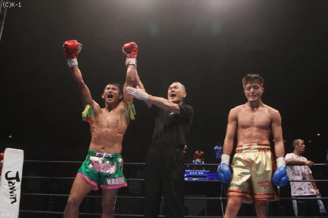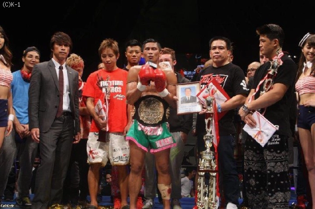 ゲーオも必死の表情で左ボディストレートとヒザ蹴り、左右田も渾身の左右のフックを打ち込むが、ゲーオを打ち崩せない。ここで試合終了となり、ゲーオが判定2-0で勝利。K-1-65kg初代王座のベルトを手に入れた。試合後、ゲーオは周囲に感謝の言葉を述べると、先月亡くなった父にベルトと勝利を捧げると語った。