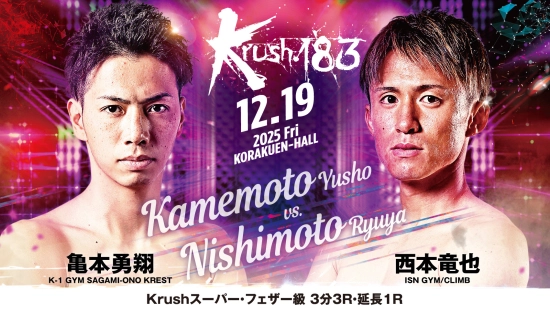 「Krush.183」12.19(金)後楽園 亀本勇翔vs西本竜也 コメント公開! 「竜也がローリングソバットしてきた所にフグトルネードのクロスカウンターを当ててKOします」(亀本)vs「パンチでダウンを取ってコーナーに登る練習をしました」(西本)
