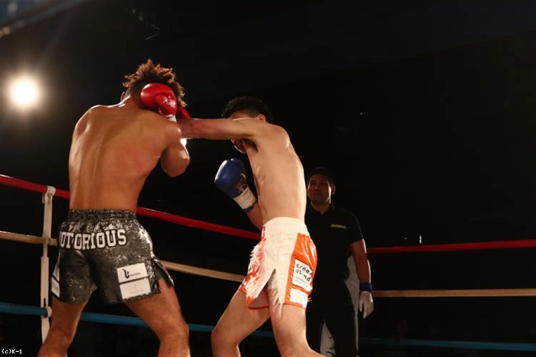 再開すると、しかし近藤は攻めのリズムを落とさず、右ストレートを連続で当て、さらにボディへのヒザ、顔への跳びヒザと攻める。さらに東本の攻撃を見切ったか、近藤は目先でスルリスルリとかわしていく。そしてサウスポーに変わって近藤は東本に向き合う。