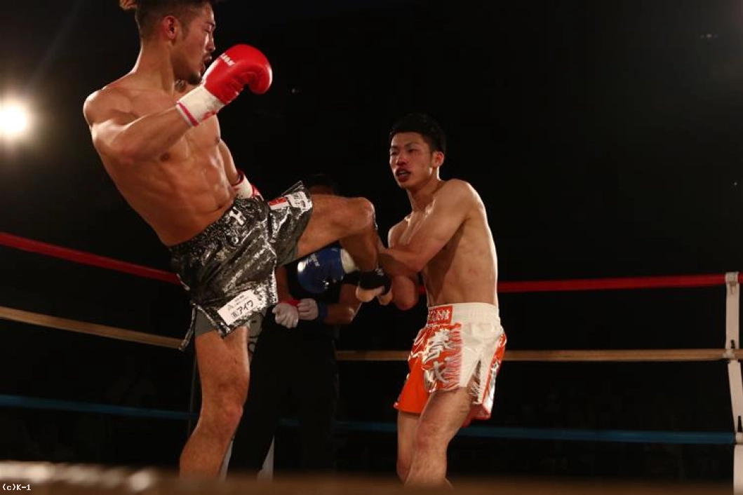 1R、東本はサウスポーから右ジャブ、左ミドルを飛ばす。これに対し近藤は前蹴り、ロー、右ストレートで前に出んとする。まずは両者距離の探り合いだが、ストレートで前に出た東本の体をスルリとかわし、近藤が右ストレートからパンチのコンビネーションで攻める。鼻柱に紅潮が見られる東本。