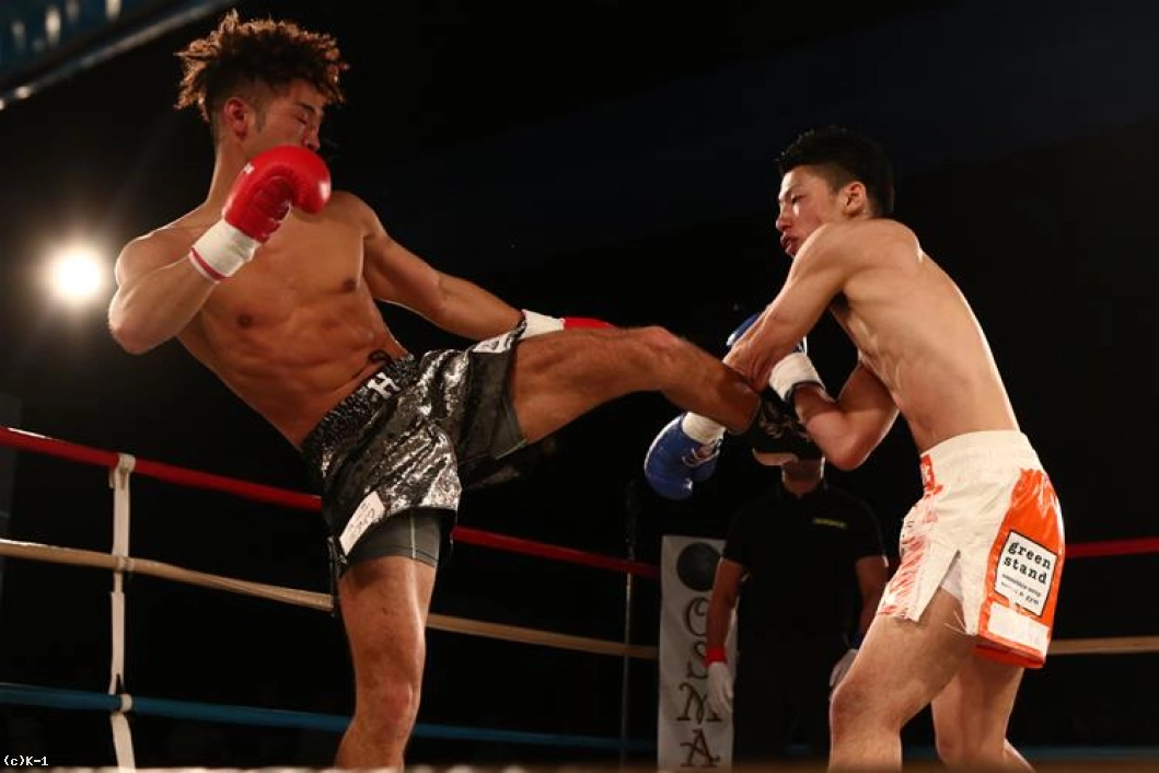 2R、近藤は右ストレートを当て、そこから左フック、ボディへのヒザと攻撃を回転させる。しかし続けて放った右の蹴りがやや低くなりローブローとなってしまい、東本に回復のインターバルが与えられる。