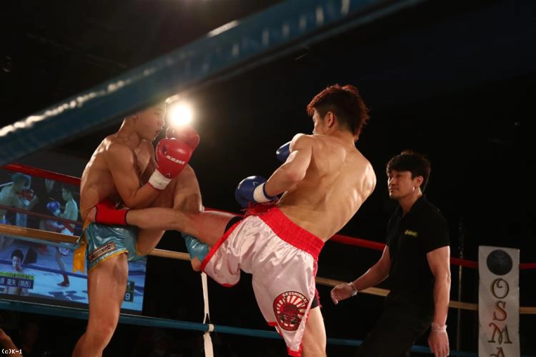 1R、両者ローの蹴り合いから椿原は右ボディフック。椿原は遠い距離からでも速い踏み込みでパンチを振るっていく。変則的な動きを見せたい森坂だが、椿原のスピードに自分の動きができていない印象。椿原は左ハイ、押して出ての跳びヒザとなおも森坂を攻める。椿原は攻撃のピッチとスピードを落とさず、さらに左右のミドルを森坂に打ち込んで初回を終える。